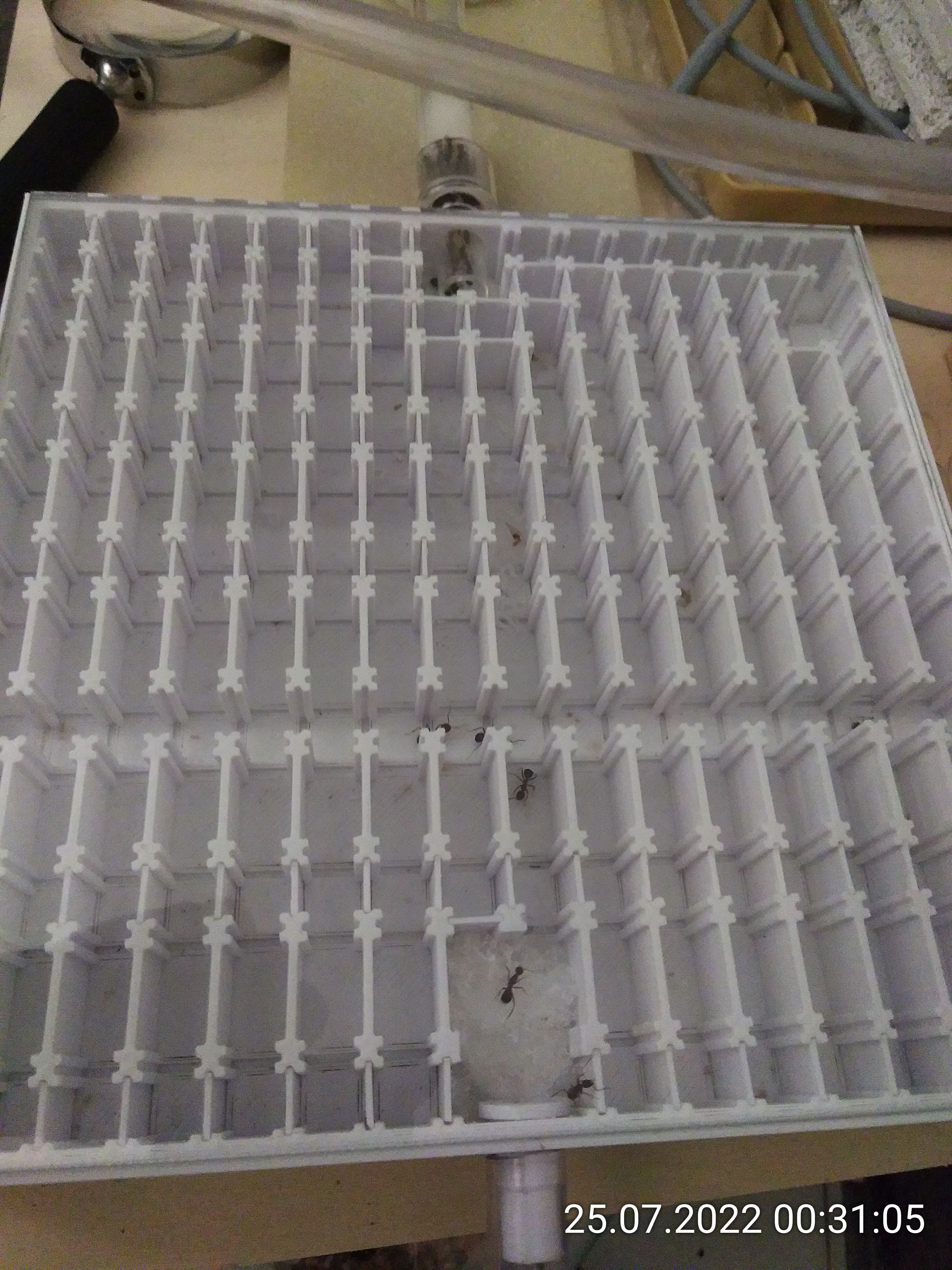 Die erste läuft sofort rein, alle anderen drehen erschreckt vom Anschließen um. Dann werden es aber schnell mehr und sie erkunden fleißig die vielen Sackgassen. Nach kurzer Zeit entscheiden sich zwei zusammen für den richtigen Weg und ziehen es durch. Sie kommen fast gleichzeitig im Ziel an. Ich habe es nicht sekundegenau erfasst, aber es waren ca. 3 Minuten.