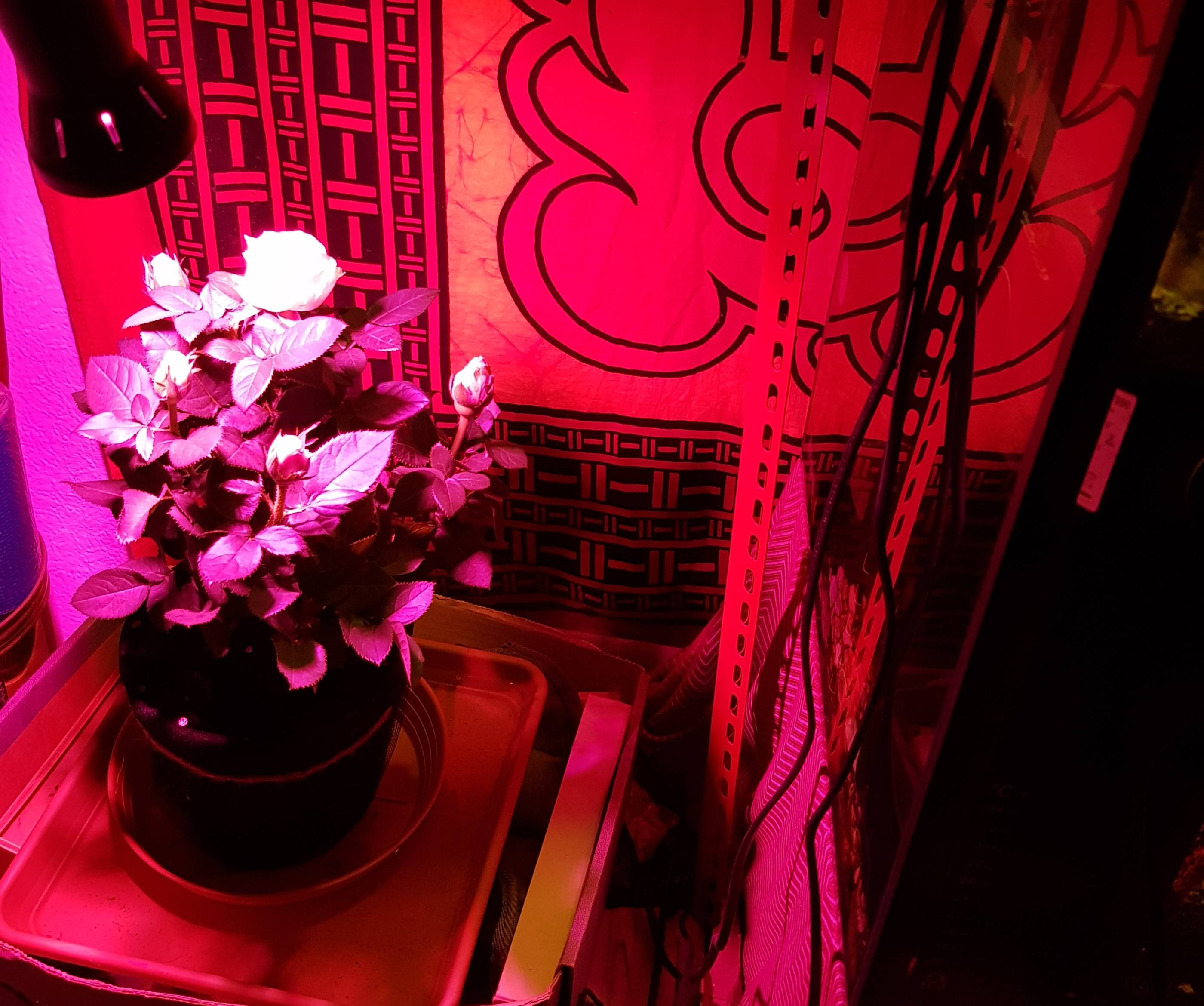 Das neue Setup zeigt tatsächlich noch keine Schwäche-Erscheinungen, das ist diesmal ohne Watte und stattdessen deckt eine Mehrfachschicht Fliegennetz die Erde ab. Plus eine violette Pflanzenlampe, gute Blumenerde und Dünger. Sobald die jetzige Rose eingeht kann ich sie direkt durch die neue ersetzen, da schon Läuse drauf sind.