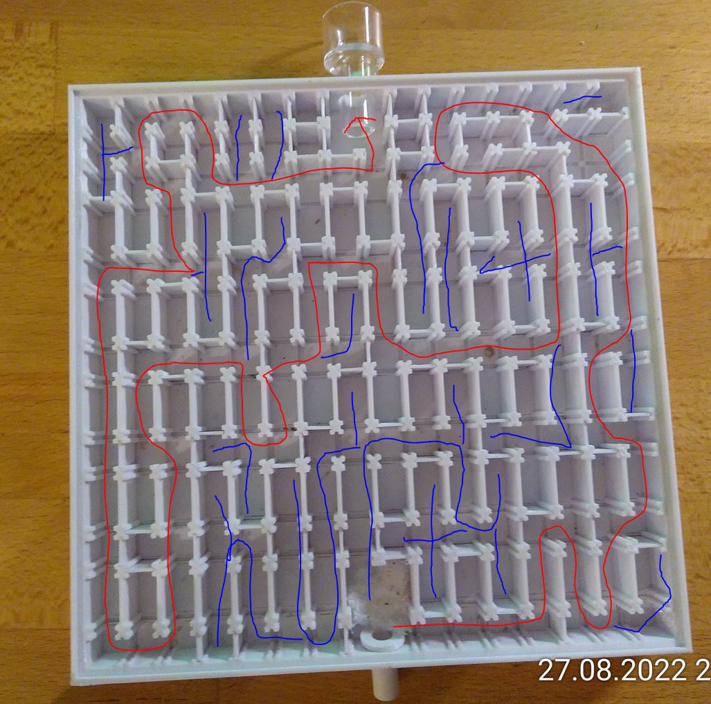 Die ersten 4 gehen alle in die Sackgasse. Kurz darauf entscheidet sich eine von ihnen anders, dreht um und nimmt den richtigen Gang. 2 andere folgen ihr. Nur die erste ist aber zielstrebig. Bis sie in die Nähe des Ausgangs kommt. Dort versucht sie plötzlich abzukürzen. Aber sie schafft es nicht. Nach 5 Minuten sind sie nicht weiter als 30 % gekommen. Kein Fortschritt nach 10 MInuten. Fast hätte ich es wieder verpasst. Um 23:11 Uhr war es endlich so weit.