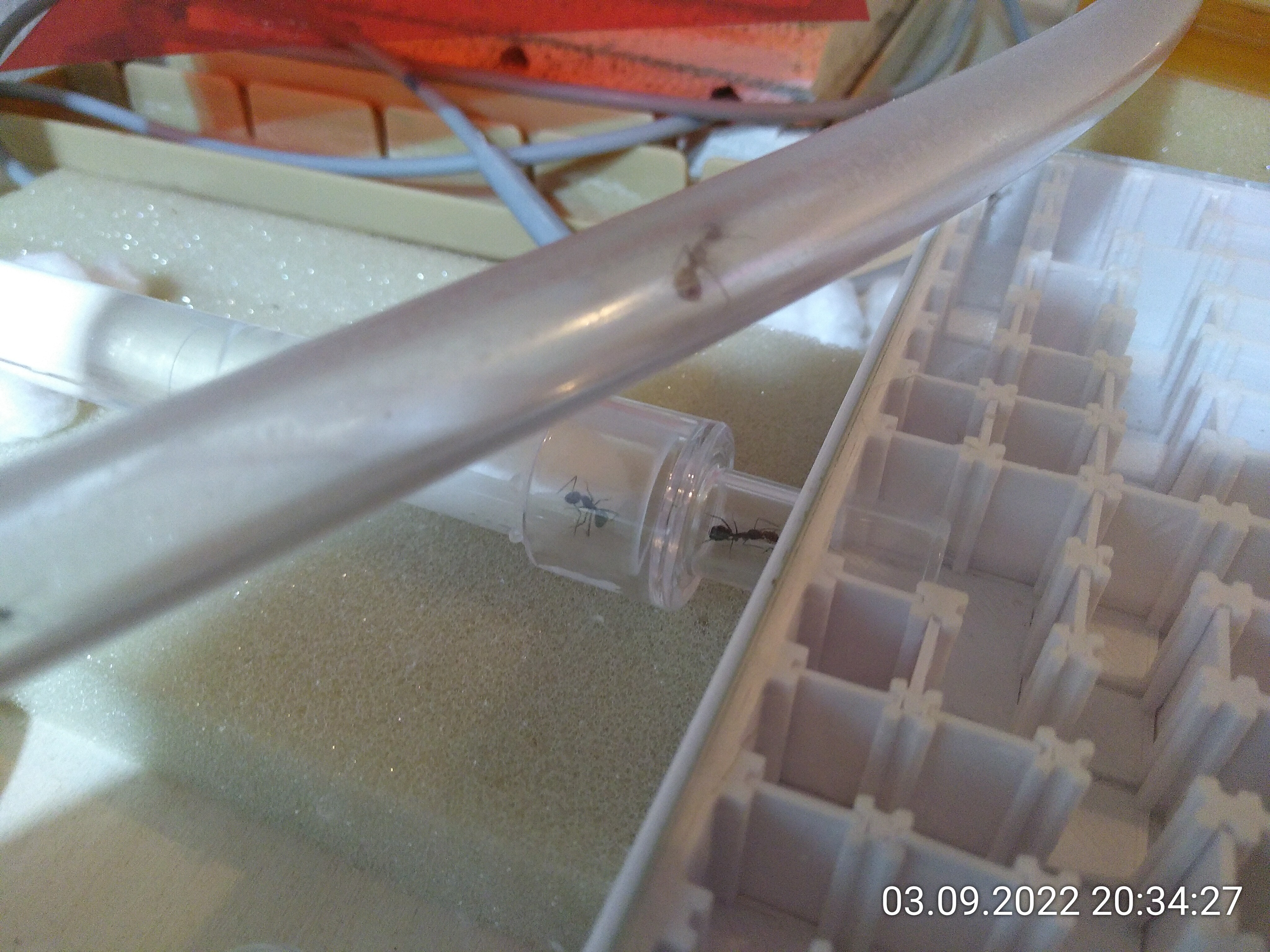 Ich habe das bemerkt, als ich ihnen neues Wasser gab und das einte oder ander Mal eine Ameise sich irgendwo im Wasserspender versteckt hat, (weiss bis heute noch nicht wo genau).