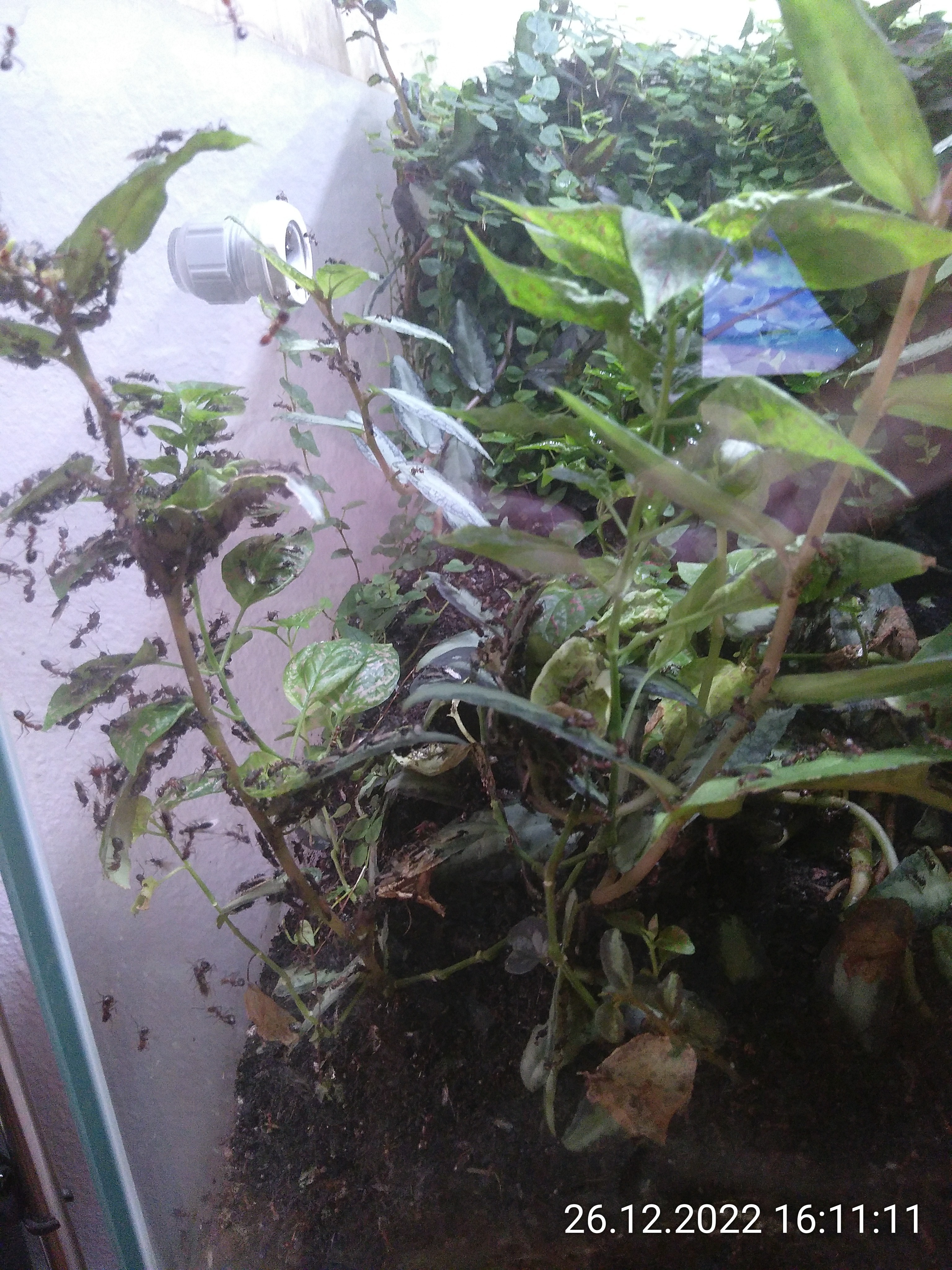Heute Nachmittag habe ich kurz hintereinander vier Ameisen außen am Steinbruch gesehen. Um den Ausbruchschutz habe ich mich wohl offensichtlich zu lange nicht mehr gekümmert. Irgendwo muss es eine Stelle geben, wo die Ölbarriere versagt. Ich habe beide Sperren wieder erneuert und damit ein paar Monate Ruhe. Im Dschungel ist Ausbruchschutz im Moment kein Thema. Sobald ich den Deckel öffne, gibt es mehrere Stellen, an denen sie von Pflanzen auf den Rahmen laufen können. So lange ich das nicht ändere, brauche ich auch keinen Ausbruchschutz.