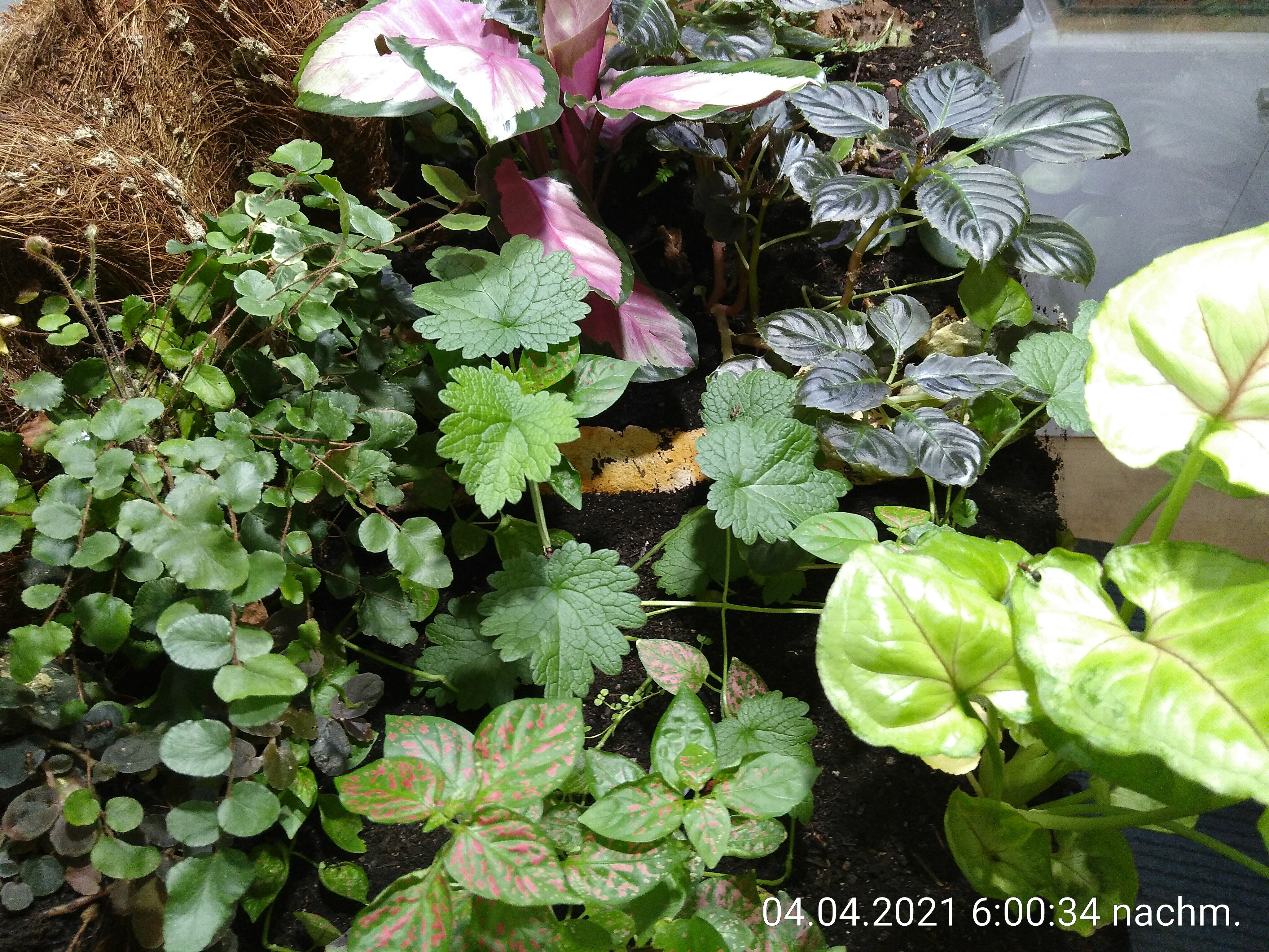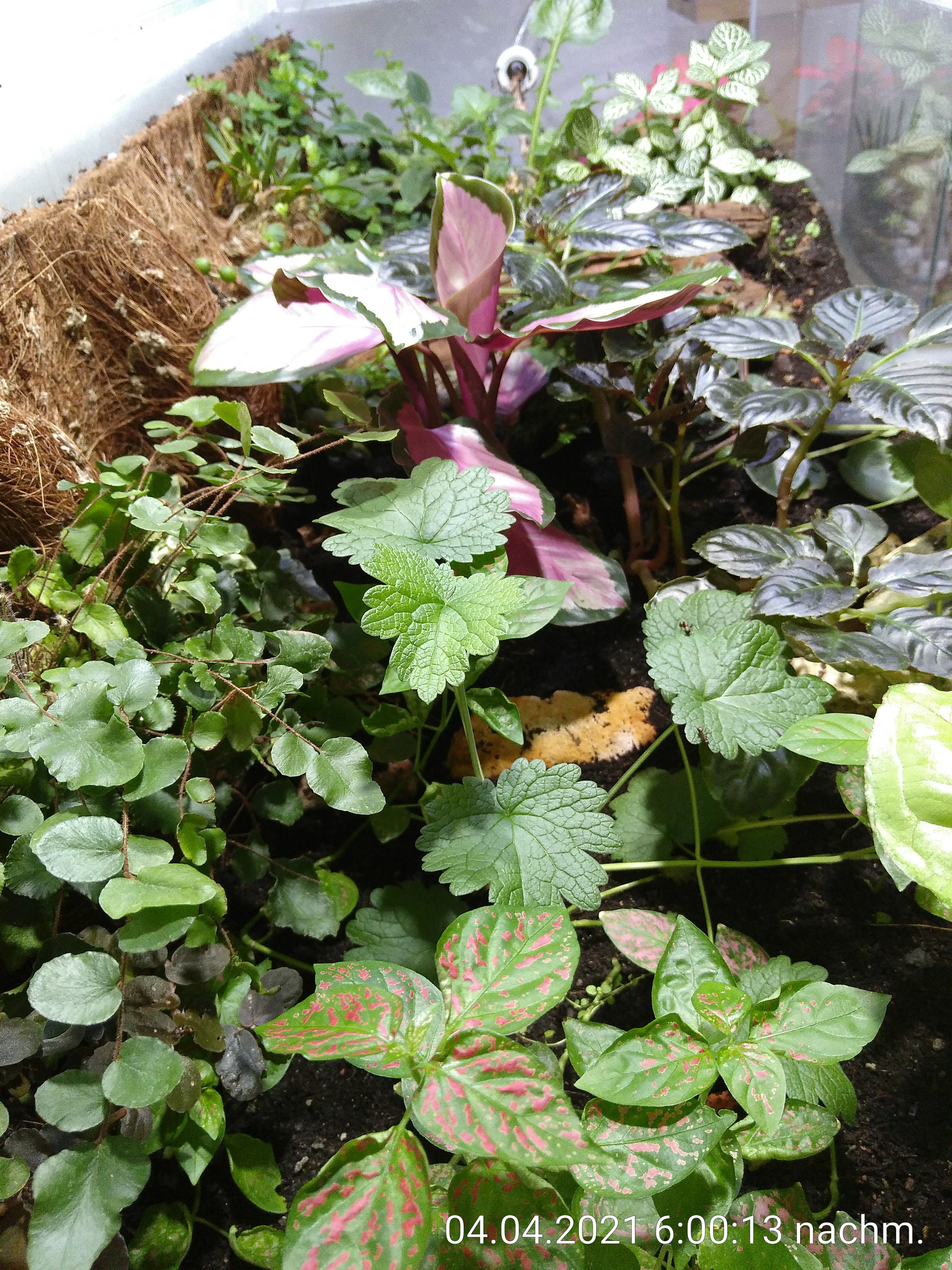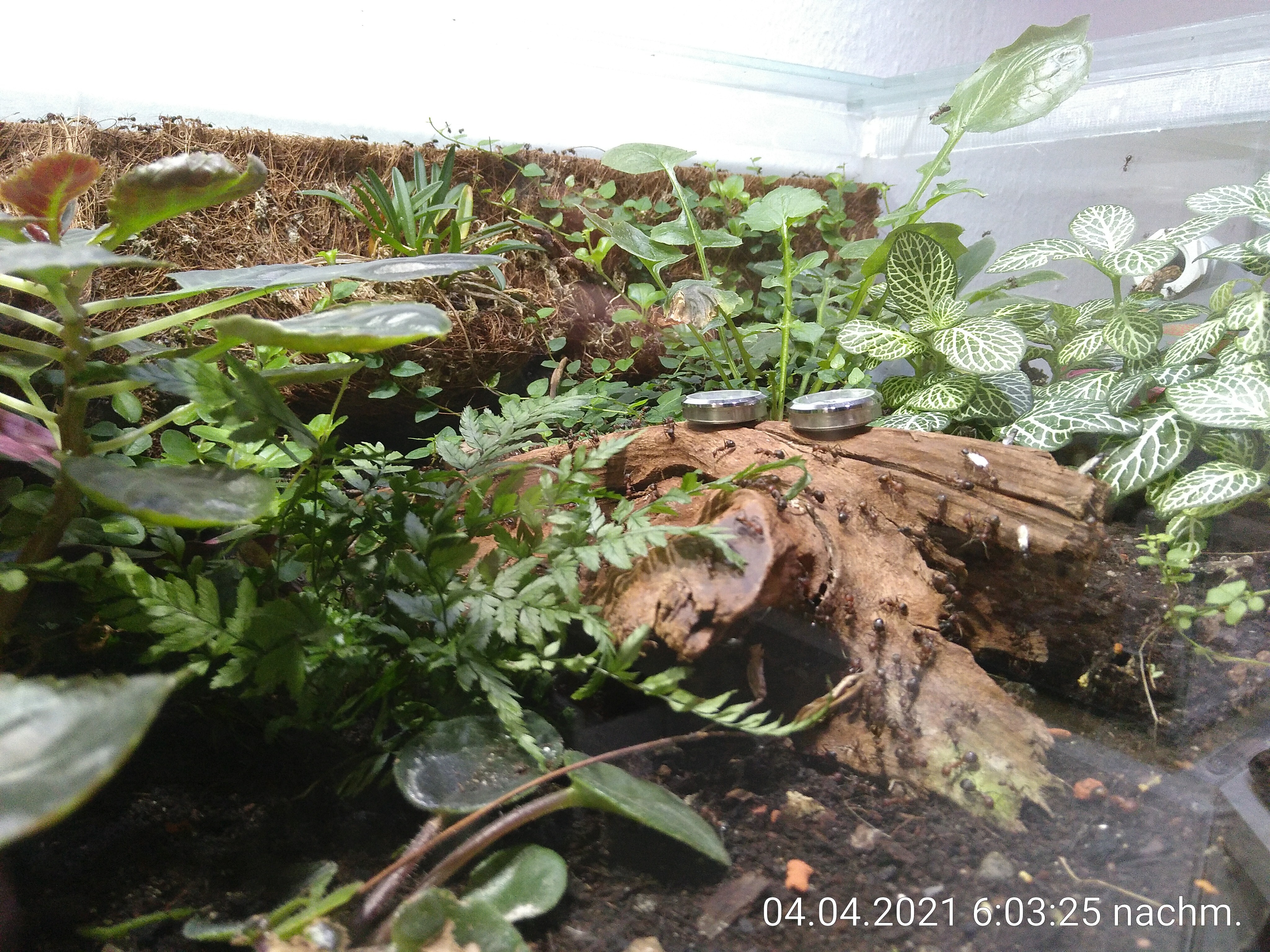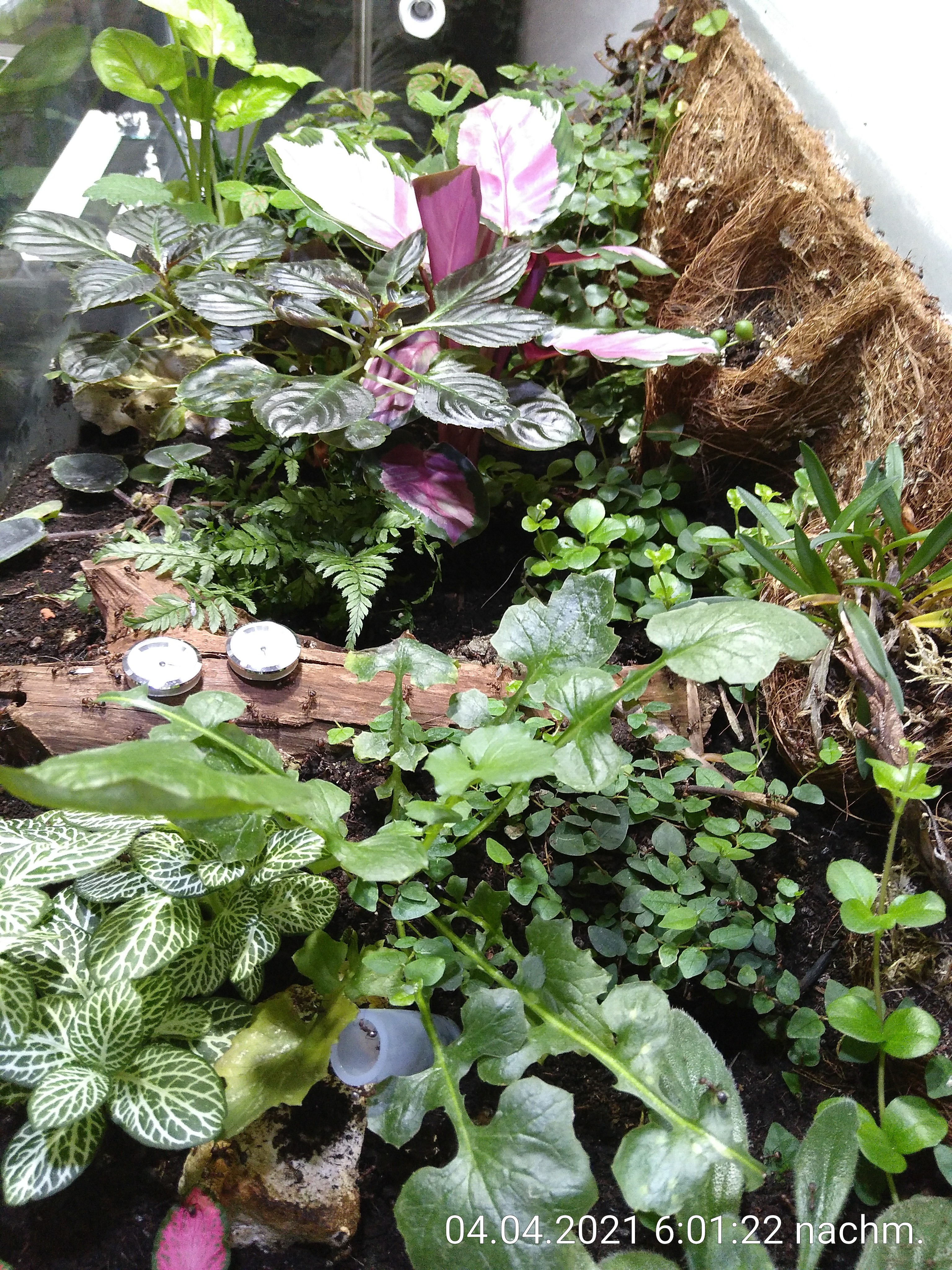 Und der Dschungel dschungelt so vor sich hin. Sie bauen ihre Tunnel weiter aus und die Pflanzen werden immer dichter und müssen natürlich auch regelmäßig erkundet werden. Ein paar Pflanzen haben die ersten Monate aus verschiedenen Gründen nicht überlebt. Ein Moos wurde einfach mit Abraum verdeckt, ein anderes hat zu wenig Licht unter der zentralen Pflanze mit den pinken, großen Blättern bekommen. Für die anderen beiden waren die Verhältnisse wohl nicht passend, mein Fehler bei der Auswahl also. Dafür habe ich aber auch neue Pflanzen dazu gesetzt. Eine Ranke mit kleinen grünen Blättern habe ich geteilt und an zwei Stellen an der Rückwand eingepflanzt. Die in der hinteren rechten Ecke macht ihren Job schon super und begrünt die Rückwand erfolgreich. Vor ein paar Wochen gab es dann noch einen Farn für eine leere Stelle und ein kleines Efeu an einer anderen Stelle an der Rückwand. Vor allem die rankenden Pflanzen sorgen jetzt so langsam dafür, dass es überall ein bisschen grüner wird. Bin gespannt, wie das in ein paar Monaten erst aussieht. Mein Plan scheint aufzugehen :)
