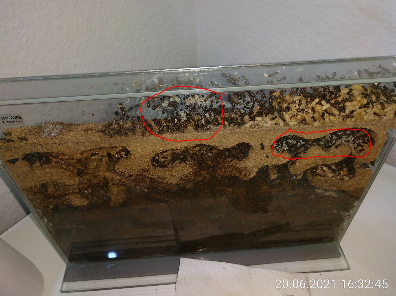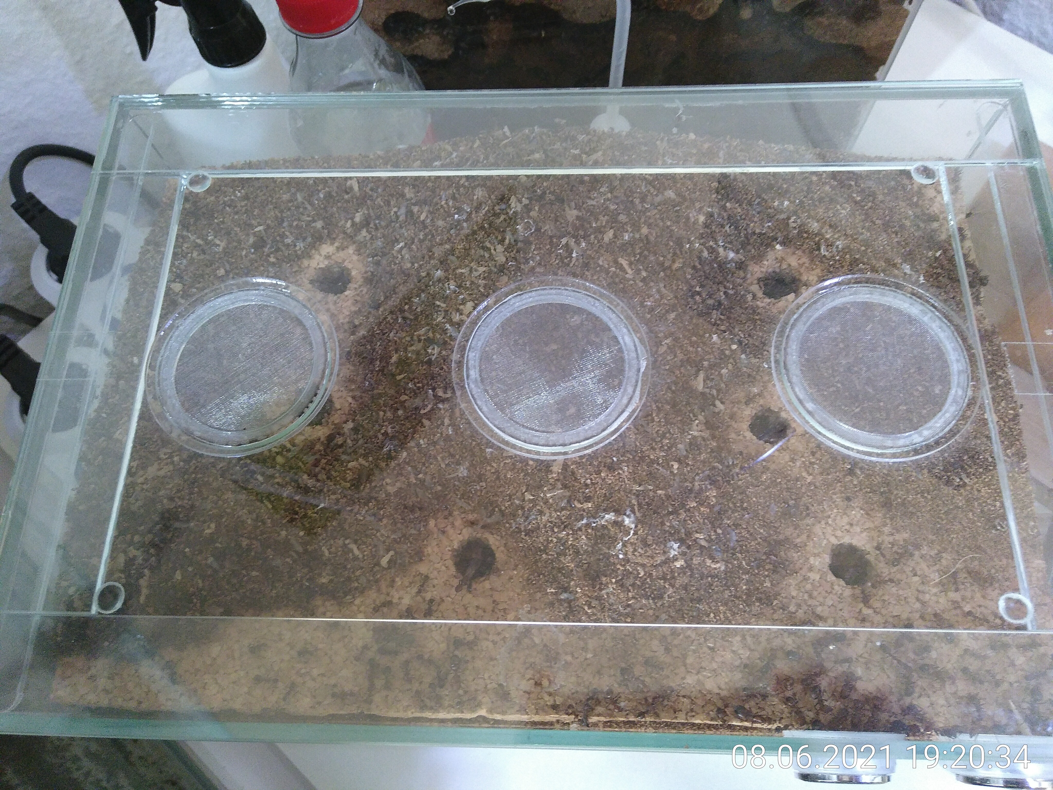 die Quarantäne-Station ist aufgelöst! Von den letzten 5 multibefallenen haben 3 überlebt. 2 waren am Ende komplett milbenfrei und eine Ameise hatte nur noch eine Milbe. Sie durften alle 3 wieder zurück zu ihren Schwestern! Ich bin eigentlich nicht viel schlauer als vorher, aber schon lange nicht mehr wirklich beunruhigt. Selbst multibefallene Ameisen können überleben. Das hätte ich nicht erwartet. Sooo tödlich scheinen diese Viecher also nicht zu sein und da ich auch keinen Bevölkerungsrückgang bemerke, sehe ich auch keinen Grund mehr zum Handeln. Wenn ich nach Milben suche, finde ich natürlich immer noch welche, aber es scheinen nur wenige Ameisen betroffen zu sein. So lange ich keine gravierenden Veränderungen bemerke, unternehme ich in dieser Hinsicht nichts mehr.