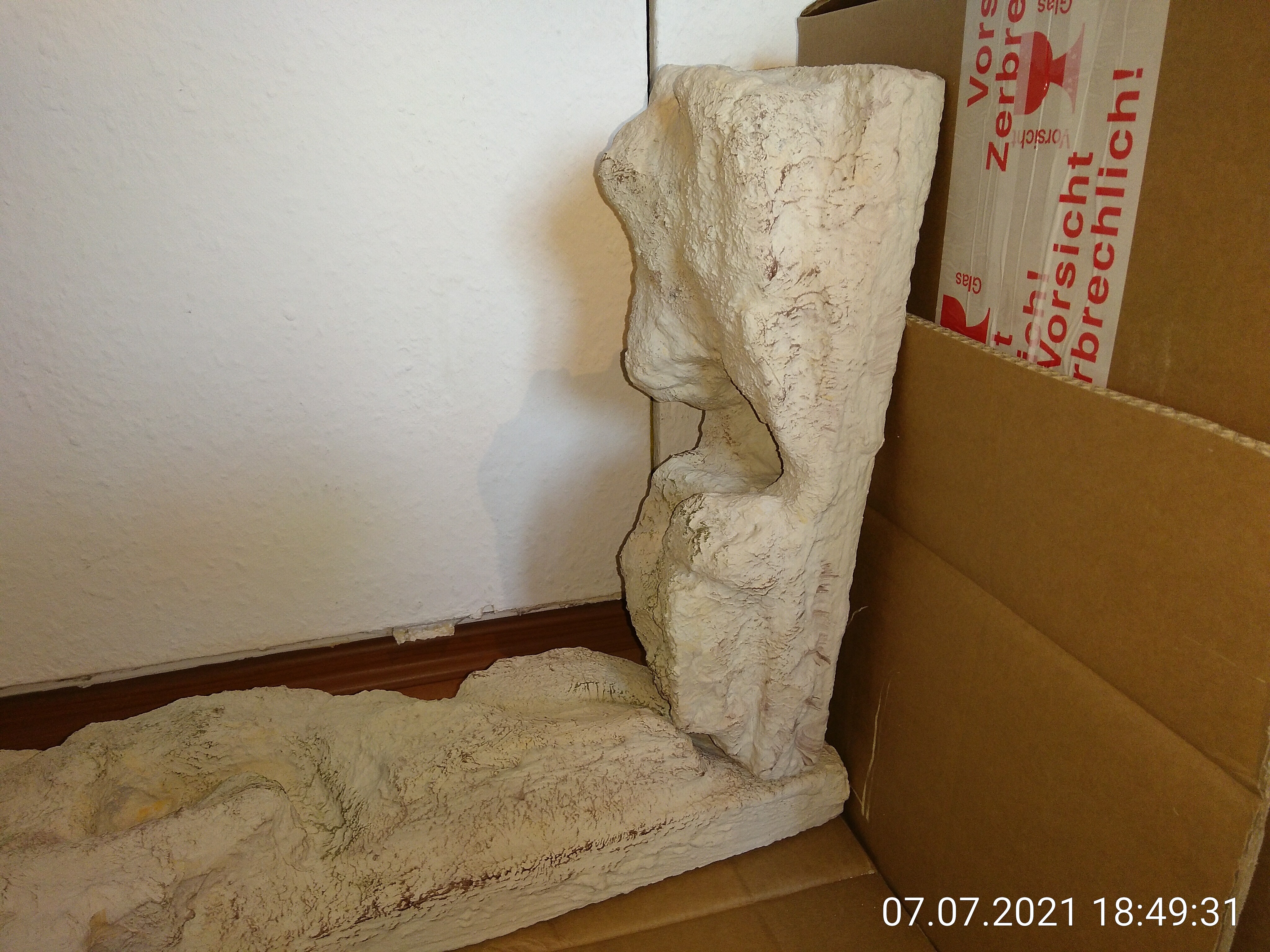 Da die Rückwand an beiden Seiten abgeflacht ist, kann ich dort gut mit der Säge ansetzen. Beim ersten Versuch gestern habe ich natürlich schon zu viel abgesägt, da wird eine Lücke bleiben. Habe aber gelernt für's andere Teil. Danach kam dann mühsame Kleinarbeit mit einem Messer, aber jetzt passt es. Hoffentlich auch noch, wenn eine neue Gipsschicht über der "Wunde" ist. Das hat ca. 2 h gedauert, nur für die kleine Seite. Der Rest der Arbeit ist für das Wochenende eingeplant. Und Das Einkleben wird auch nicht so einfach, wie gedacht. Dafür brauche ich jetzt ein 2. Paar Hände.