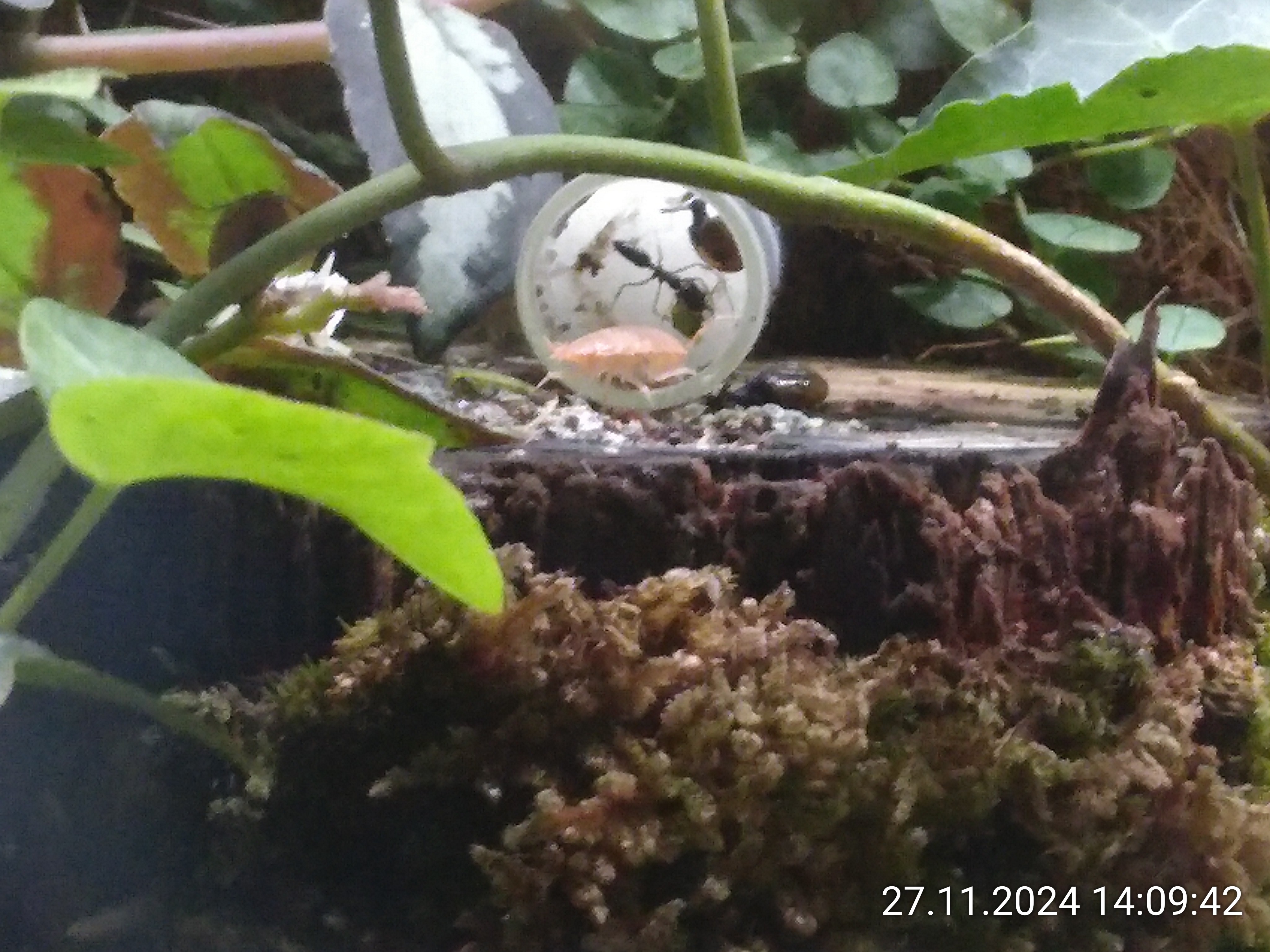 in einem ersten Schritt vor ca. drei Wochen habe ich fast alle großen Panda-Asseln und einige der anderen erwachsenen Exemplare entfernt. Das hat sich positiv auf die Fütterung der Schnappis ausgewirkt. Ihre Konkurrenz ist deutlich weniger groß, vielzählig und aggressiv. Sie bekommen deshalb immer häufiger etwas ab. Halbe Mehlwürmer und Heimchenteile transportieren sie relativ schnell ins Nest. Aber immer alleine. Kooperation habe ich noch nie beobachten können. Ich bin froh, dass die Versorgung jetzt besser klappt. Das wirkt sich hoffentlich positiv auf die Entwicklung aus.