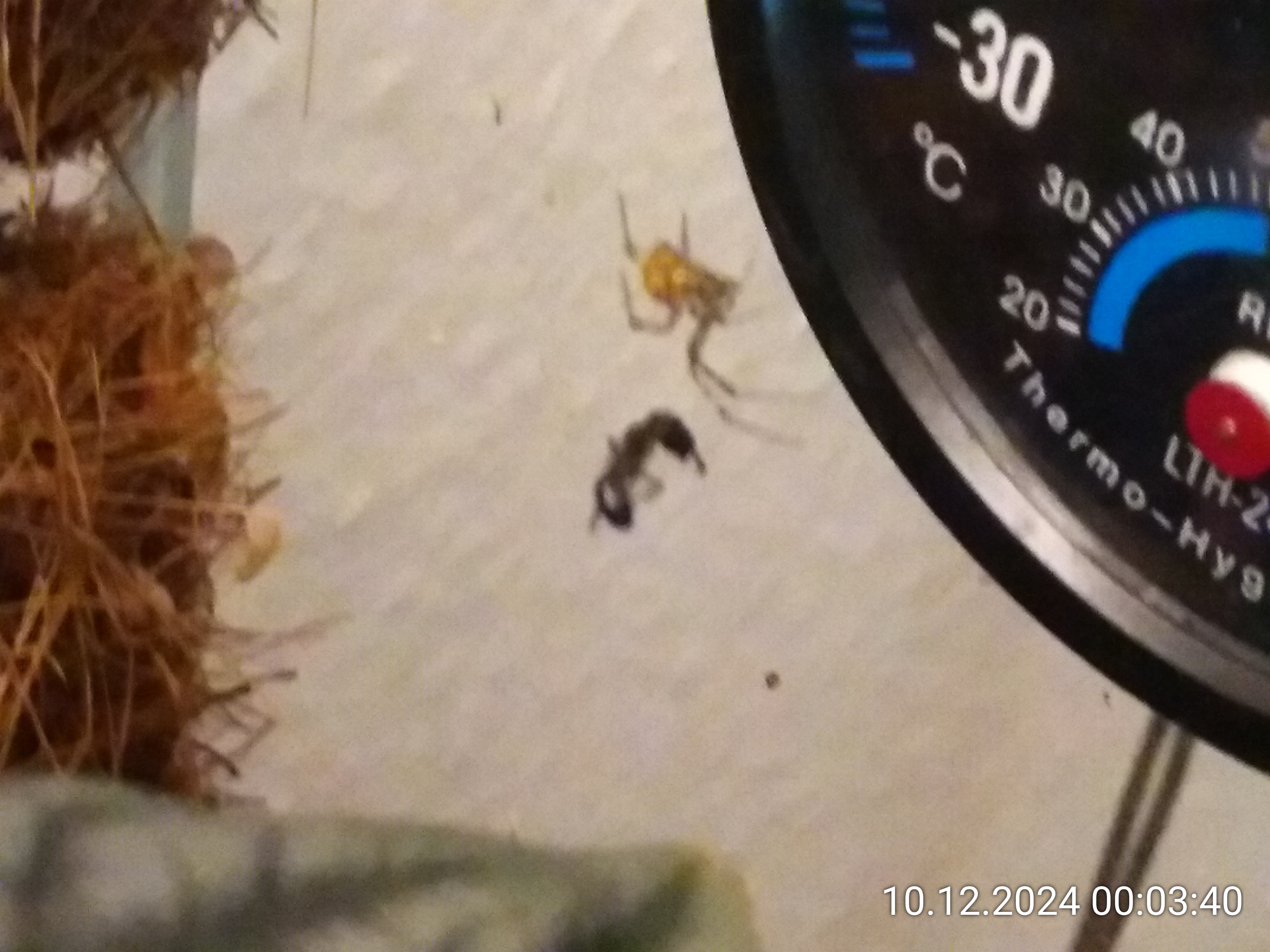 Aber das Spiel war noch nicht zu Ende. Die beiden anderen sind noch über eine Stunde direkt vorne am Glas, für mich in einer idealen Position, umeinander herumgetanzt. Wenn man das so nennen darf. In einem ihrer Ringkämpfe sind sie dann wohl richtig zur Sache gegangen. DIe Nico hat bestimmt einen Stacheltreffer abbekommen und die Schnappi eine ordentliche Ladung gesprühte Säure. Danach waren sie mehr mit sich als mit der anderen beschäftigt. Die Nico hat sich noch über eine Stunde lang bewegt, aber nicht mehr viel und fast nur auf Körperkontakt, auch mit Asseln, die sie schon fast als Futter beschnüffelten, hin. DIe Schnappi hat sich nicht mehr voll kontrollieren können, lief eher wie gestört und behindert hin und her. Irgendwann musste ich dann die Szenerie verlassen. Eine knappe Stunde später war die Situation eigentlich unverändert. Nochmal eine halbe Stunde später war die Nico dann verschwunden und die Schnappi torkelte immer noch durch die Gegend. Es sah aus, als ob sie die Nico suchte. Aber auch total orientierungslos. Ich schätze, die Asseln haben sich die zweite Nico geschnappt.