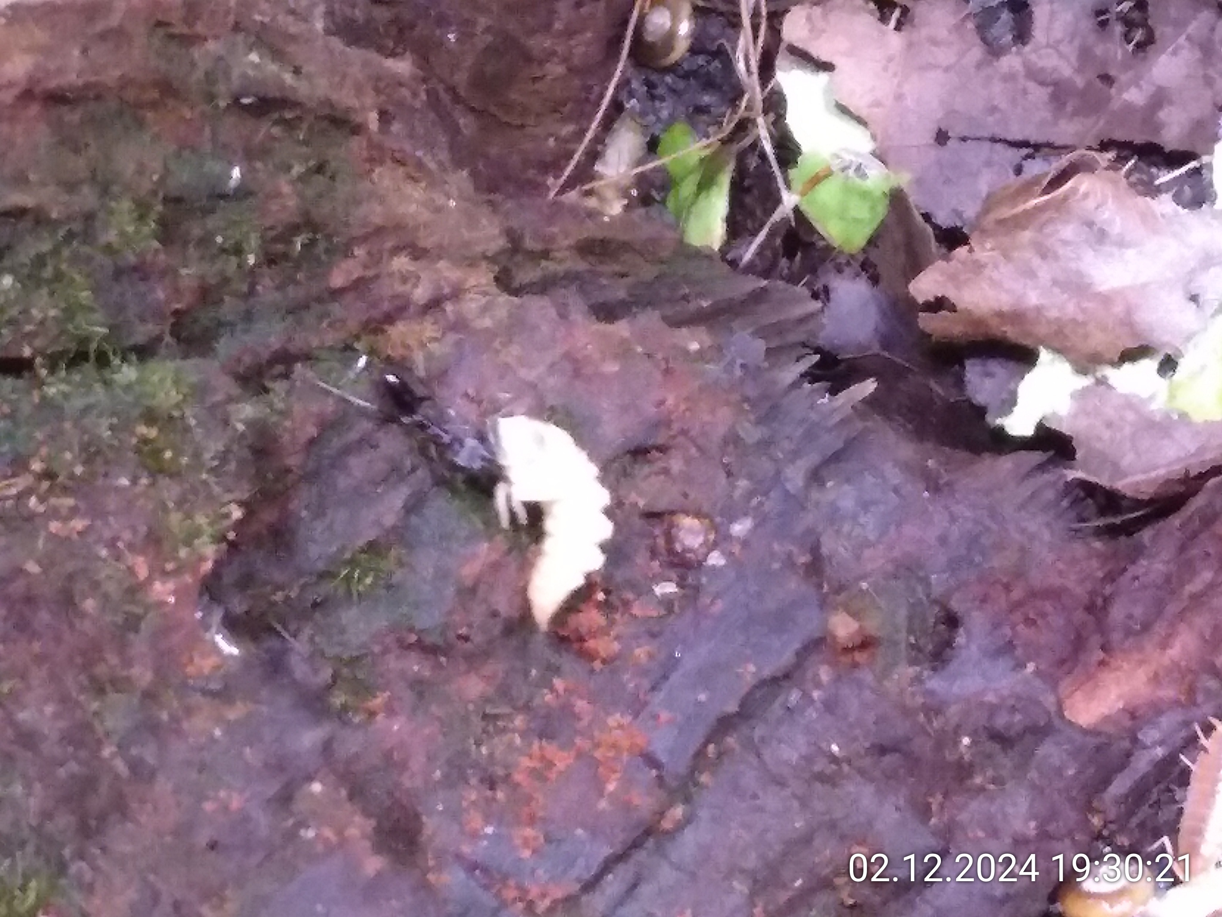 Von den ausgesetzten Hundertfüßern habe ich nur einen in all der Zeit gesehen wie er über den Baumstumpf gelaufen ist. Da drin ist bestimmt tierisch was los. Es gibt so viele Nischen, Spalten und Gänge, durch die sich all die kleinen Krabbler bewegen. Und ständig beißen sie neue hinein. Ich sehe regelmäßig Aushub. Auch die Schnecken halten sich da gern drin auf und fressen sich langsam durch das Holz oder nagen das ab, was darauf wächst. Gerade die Schicht unter dem Moos scheint sie zu interessieren. Das ist nur leider schlecht für das Moos, das dadurch die Verbindung zum Holz verliert. Ich werde mich wohl daran gewöhnen müssen, dass das Moos auch hier nicht dauerhaft bleiben wird. Aber so ein Waldboden verändert sich eben ständig.