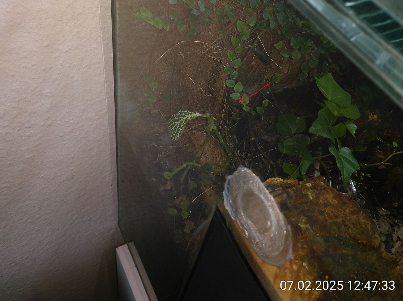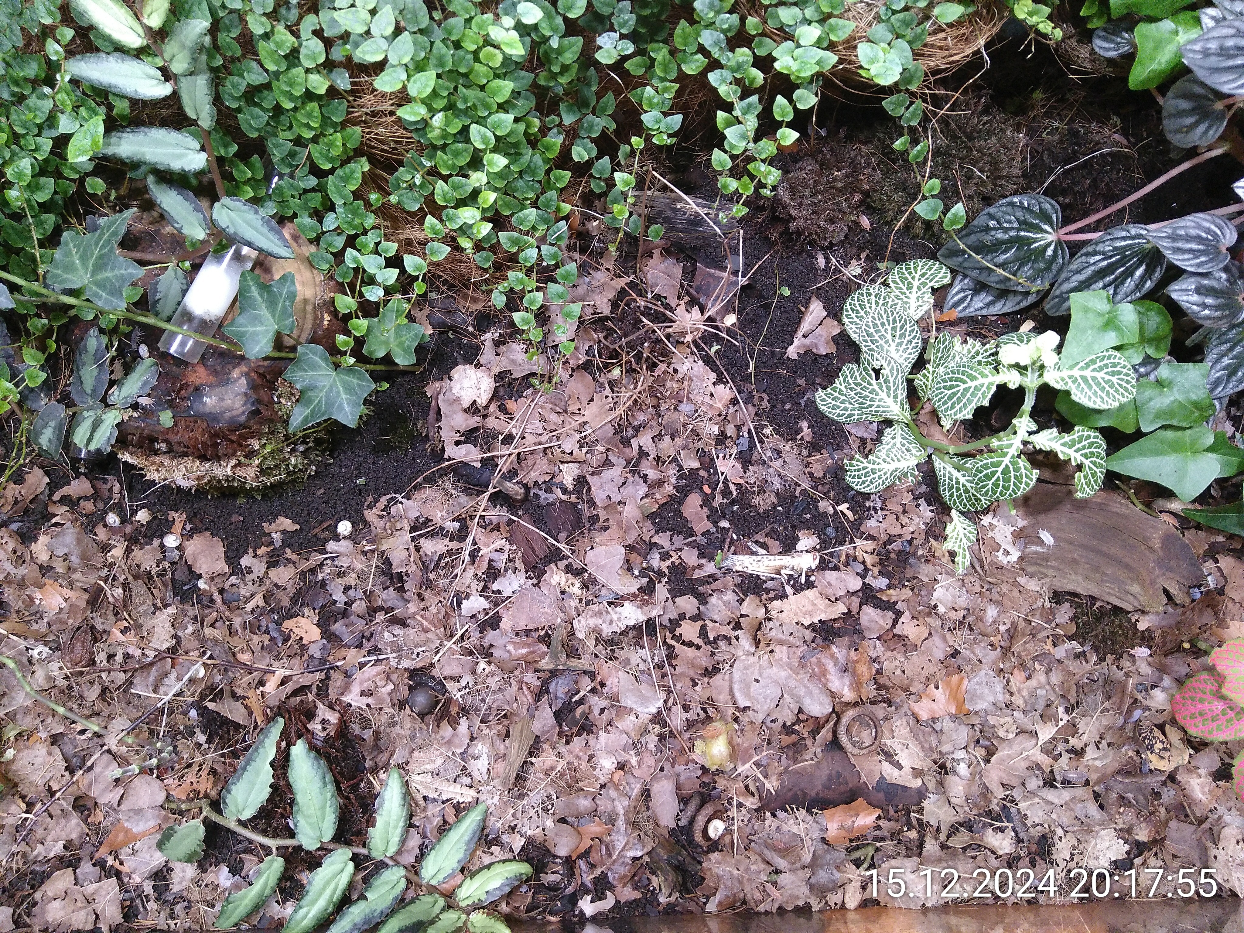 Ein kleines Loch mit ca. 1 cm Durchmesser direkt an der Rückwand. Dort platziere ich jetzt immer auch Futterinsekten. Aber die Herausforderung bleibt. Die Ameisen müssen sie eher finden als die Asseln. Allerdings geht es auch andersrum, wenn sie schnell sind. Einmal konnte ich beobachten wie eine Schnappi und eine Assel an einem Heimchen gezogen haben. Die Schnappi hat sich durchgesetzt und das Heimchen fortgezogen.