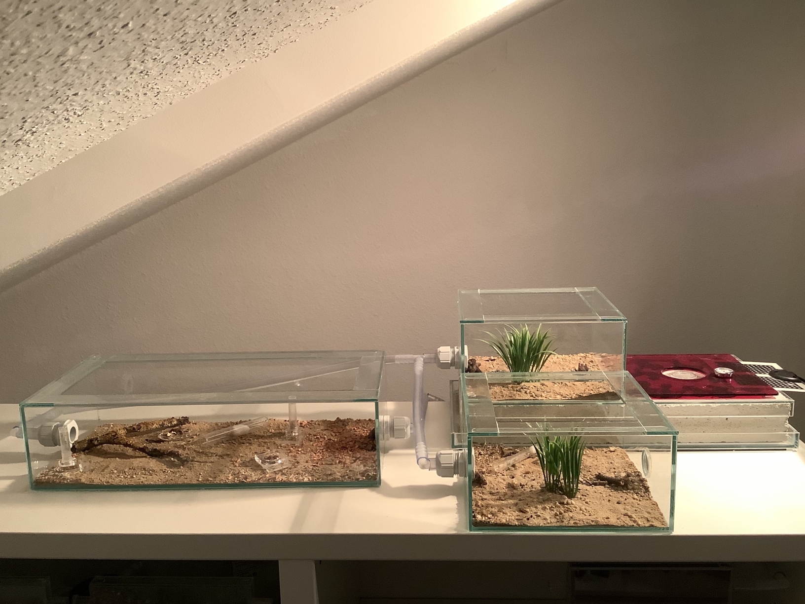 Am 18.03.2020 kamen sie bei mir an ... 1 Königin, 3 kleine Arbeiterinnen und (wahrscheinlich) eine kleine Larve. Genau konnte ich es damals nicht sehen, denn ich wollte die kleinen schreckhaften Texanerinnen (?) nicht zu sehr stressen und habe das Reagenzglas gleich mit einer roten Folie umwickelt, an eine 20*20 cm Arena angeschlossen. Den Zugang habe ich mit Stahlwolle verkleinert und die Kleinen konnten durch ein Röhrchen ein und ausgehen.