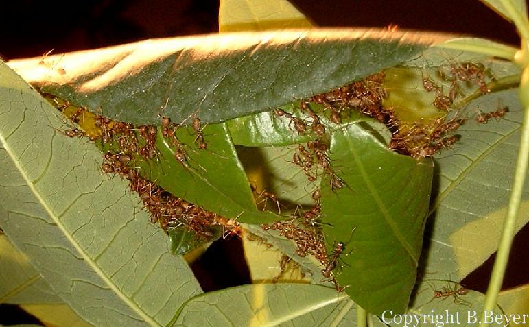 Mit beeindruckender Geschwindigkeit ging es vorwärts, einzelne Blätter waren bereits nach einigen Stunden zusammengebracht und so rückten die ersten Arbeiterinnen-Kolonnen mit Larven an. Ein nächster erstaunlicher Punkt bei dieser Art: Normalerweise würden sich die Larven in einen Kokon einwickeln, in dem sie die Metamorphose zum adulten Insekt vollziehen. Bei den Weberameisen spielt dieses Entwicklungsstadium jedoch eine entscheidende Rolle beim Nestbau. Sie spenden den "Klebstoff", um die Blätter ihrer zukünftigen Behausung zu verbinden. Die Larven werden zwischen den Mandibeln gehalten und mit den Antennen betrillert, welches sie veranlasst ihr seidiges Sekret abzugeben. Mit seitlichen Bewegungen zwischen den Blatträndern hin und her wird das Nest nun verwoben und erhält seine Stabilität. Doch in der Natur geschieht nichts aus reiner Selbstlosigkeit, denn in diesem Nest werden auch die Larven einen Platz finden, der ihnen Sicherheit bietet und wo sie versorgt werden.