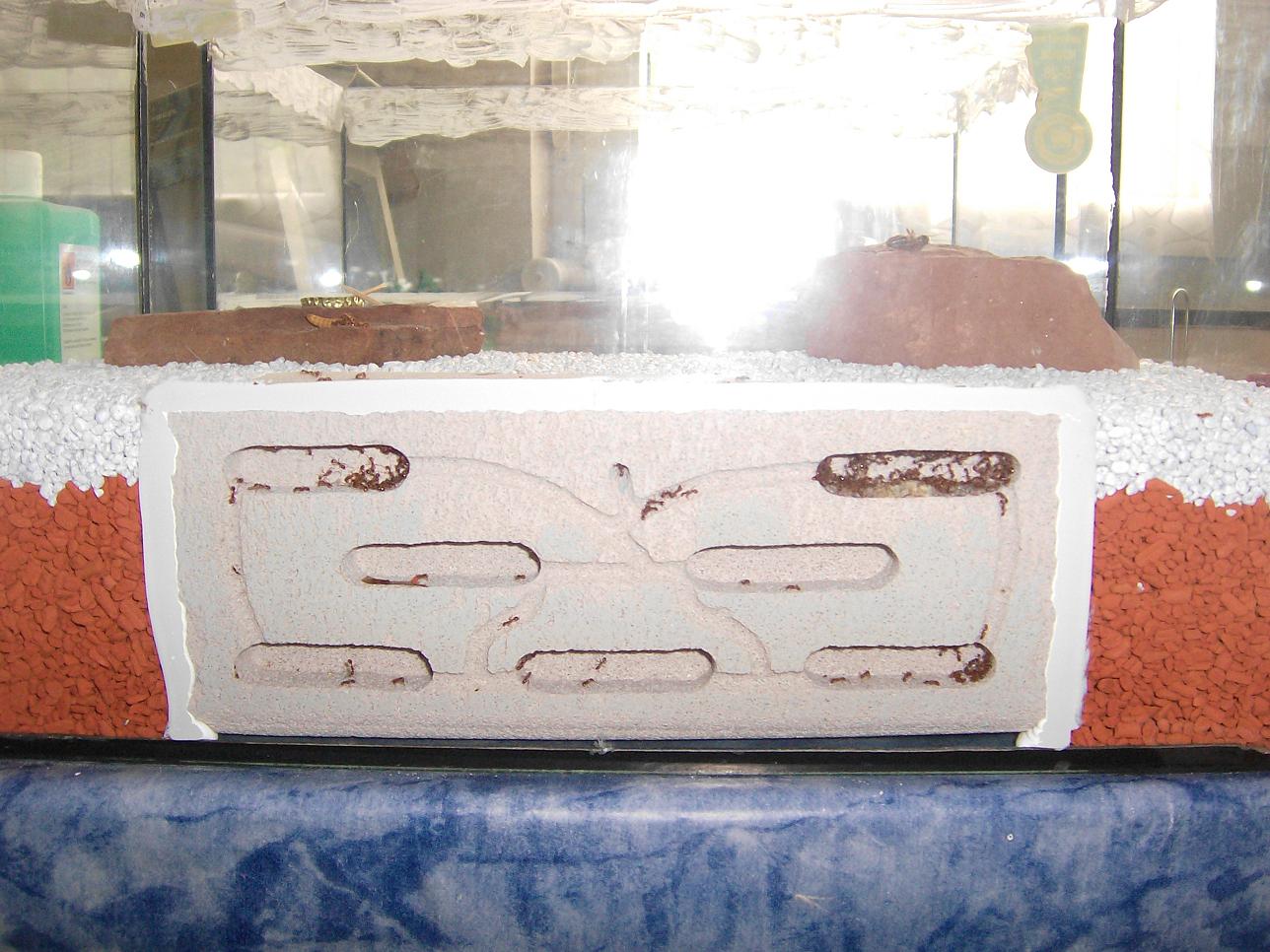 Hier ein paar Bilder vom neuen nest und vollzogenem Umzug. Das nest ist etwas gross aber wenns so weitergeht ist es bald gerade gross genug es ist auf jedem fall genug nachwuchs auf dem weg. Die kammern sind etwa 15mm X 15mm X 55mm und eine ist voll beladen und die anderen kaum aber alle ein wenig besetzt. Ich denke aber das es die richtige entscheidung war sie umsiedeln zu lassen wenn alles was draussen ist und die Brut schlüpft ist die grösse des Nestes wohl angemessen. Was meint Ihr?