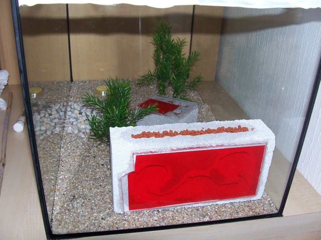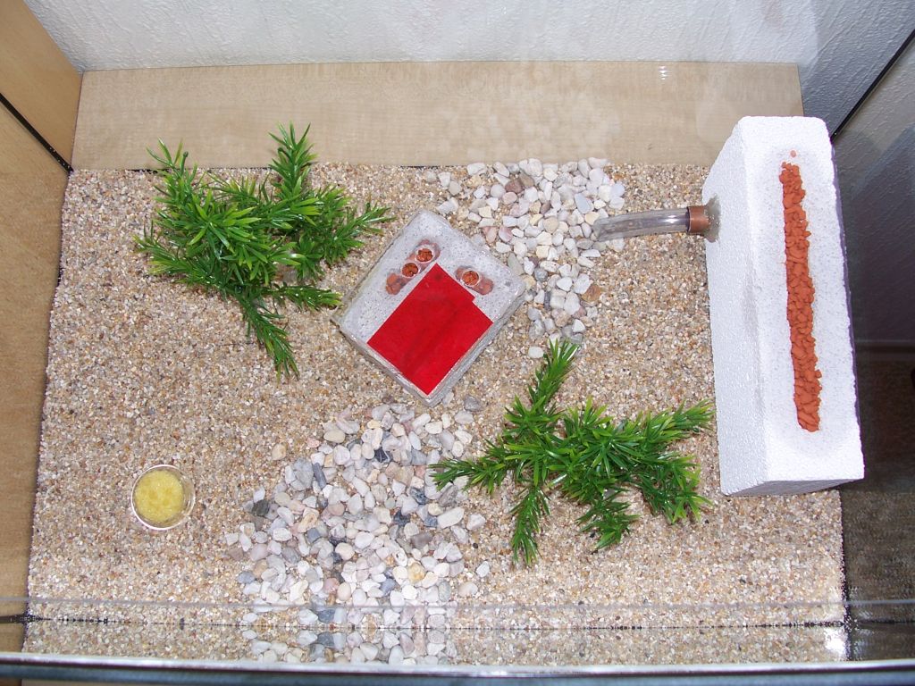 Ist ein Aquariumbecken 30x30x50 mit Ytong 20x10x5 und noch einem kleinen Ytong fĂŒr den Anfang. Bodengrund ist Aquariumkies 1-2mm und die grĂ¶ĂŸeren 5-7mm. Im Vordergrund sieht man die leider Tot angekommenen Myrmica rubra Kolonien (Eine fĂŒr mich die andere fĂŒr nen Kollegen). Jetzt steht alles leider leer und muss warten was Antstore sagt.