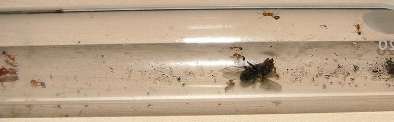 Als sie die anderen erreichte, dauerte es nur höchstens zwei Sekunden, bis sich dort alles in ein heilloses Durcheinander entwickelte. Ich konnte beobachten, wie die Arbeiterin die erste der anderen aufs hefigste betrillerte, weiter rannte und es weitergab, so wie die, welche die Botschaft empfangen hatte. Eine (!) Straße (!) bildete sich im RG. Frisch geschlüpfte Pygmäen blieben zurück, der Rest rannte zur Fliege, die noch immer von der einen einzigen, "mutigen" Jungarbeiterin beschäftigt wurde und keine Ruhe mehr hatte. Dann fielen die anderen über sie her. Da die Fliege ihnen kraftmäßig aber weit überlegen war, kamen sie nicht richtig dazu Angriffsfläche zu ergattern. Die