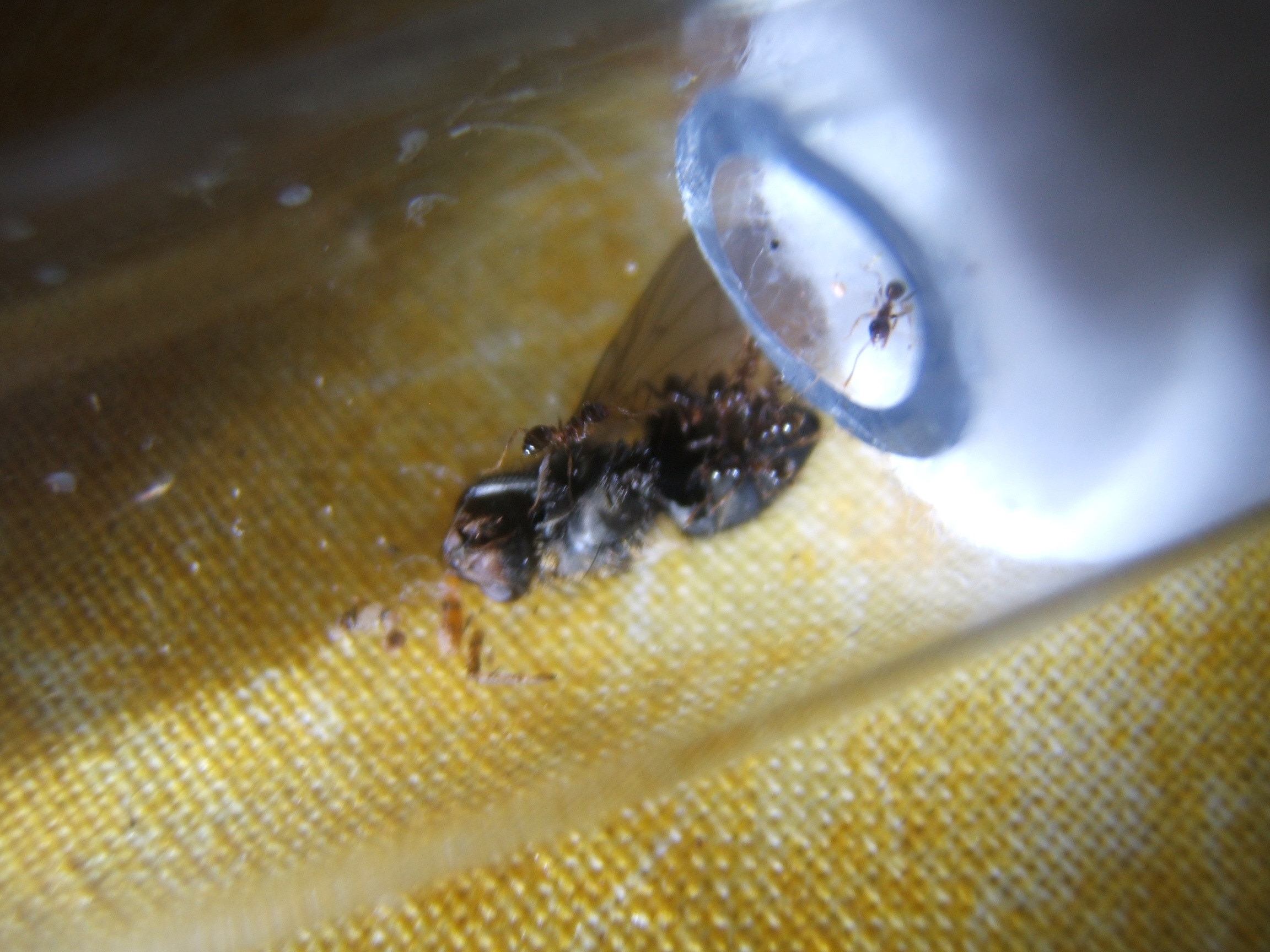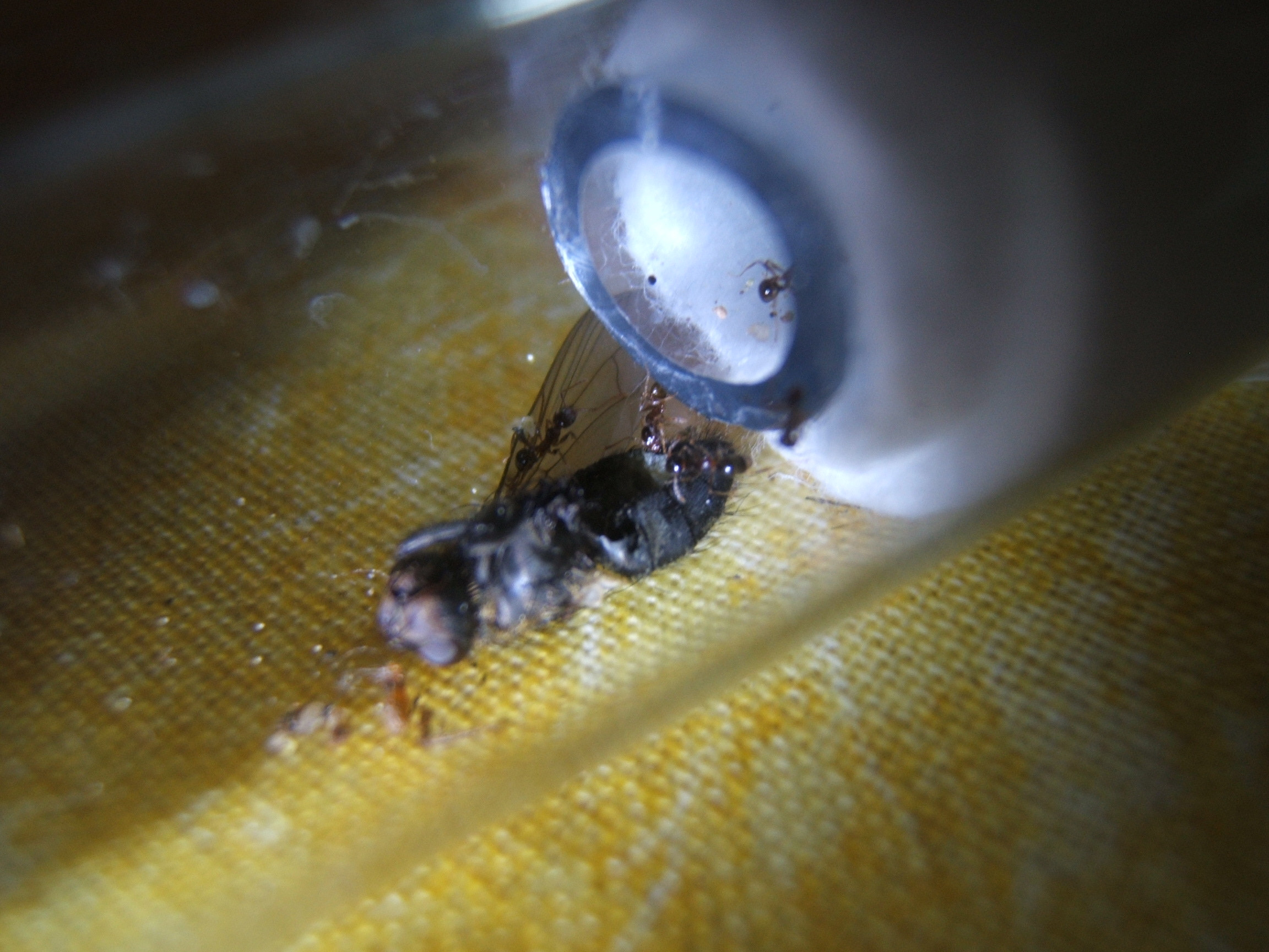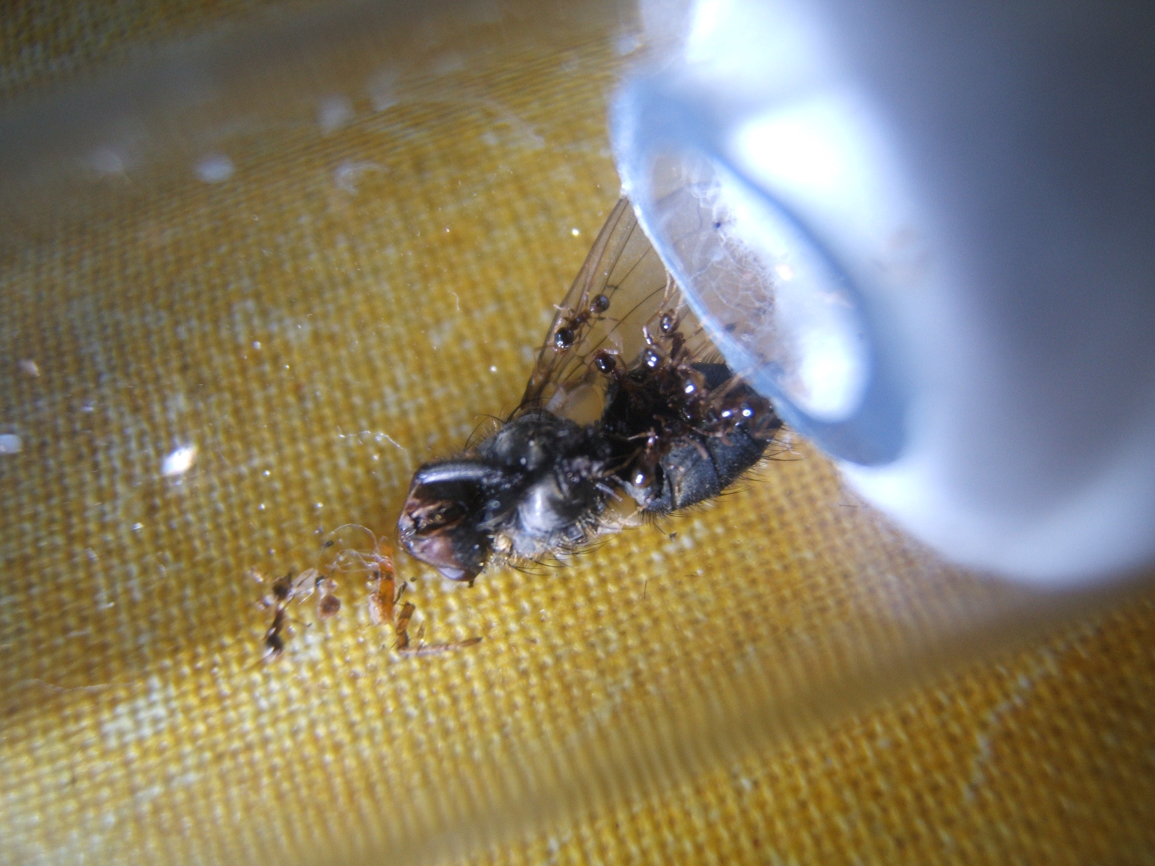 Und wieder machten sie mir einen Strich durch die Rechnung und zerteilen die Beute nun genau vor Ort!Der Hinterleib der Fliege ist schon ziemlich ausgefressen und dort drinnen wuselt es nur noch so!