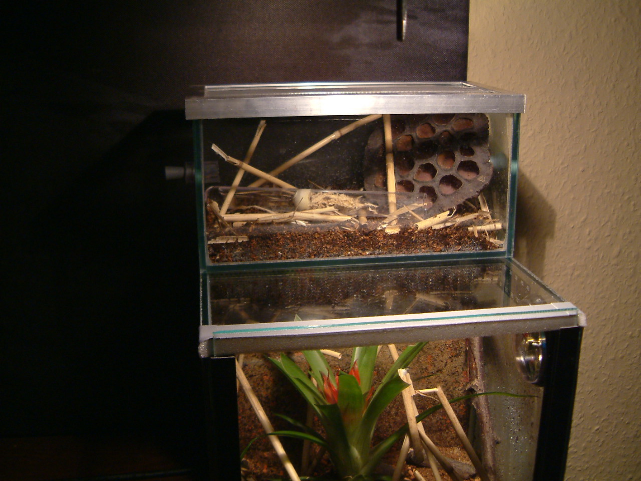 Heute habe ich die Gyne bekommen. Gehalten wurde sie bis jetzt im RG und ich werde sie jetzt weiterhin noch dort halten, bis die ersten Arbeiterinnen kommen. Also habe ich das RG in ein Formicarium getan, dass ich schon fĂŒr andere Arten hatte. Ich habe dann zunĂ€chst normale Blumenerede mit Cocushumus und Bambussplitter gemischt und ins Formicarium als Boden verfĂŒllt. Ich dachte mir, wenn die ersten Arbeiterinnen kommen, können diese sich gleich ein Kartonnest bauen. Als geplanten Nestansatz habe ich eine getrocknete natĂŒrliche Fruchtverpackung reingesetzt (keine Ahnung wie die heißt).