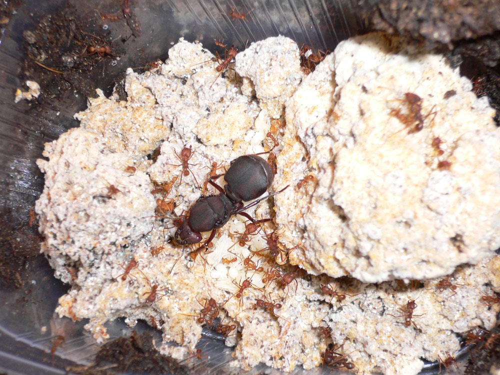 In Zwischenzeit hat sich bei meiner Atta sexdens Kolonie wieder einiges getan. Gerade Gestern habe ich ihnen Wieder neue Brombeeräste gegeben und dem entsprechend zeigt der Pilz auch einen rechten Wachstumsschub. Sehr interessant ist auch, dass sich vermehrt Soldaten bilden, seit die Kolonie eine gewisse Grösse erreicht hat.Diese stehen oft an den Wegen und halten dort mit geöffneten Mandiblen Wache.