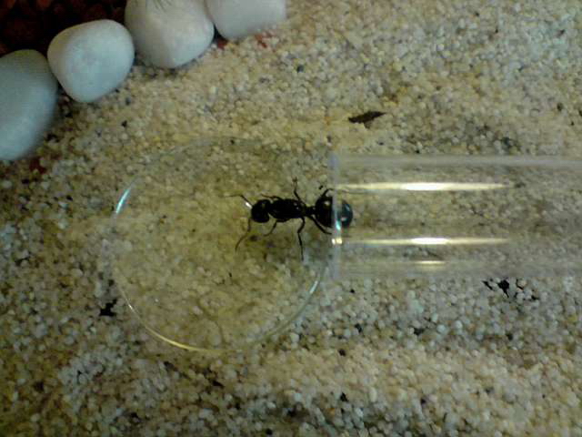 Das Photo von meiner Gyne hab ich kurz nachdem ich sie im Furmicarium deponiert habe gemacht. Es hat keine 5 Minuten gedauert da ist sie auch schon ĂŒber den Honig hergefallen und hat eine satte viertel Stunde daran genippt. Muss also ziemlich Hungrig gewesen sein. Als sie fertig war hab ich ihr ein "Schutz" aus roter Folie ĂŒber dem RG errichtet und mittlerweile hat sie ihre Behausung selber mit Hilfe von Seramis wieder zugemauert. :-)