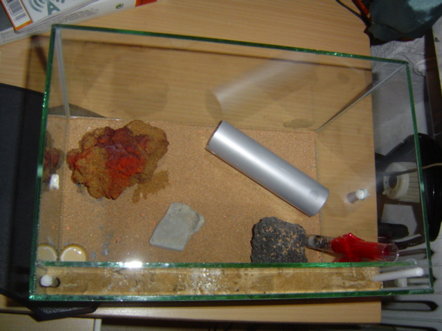 So eins noch: Habe Futter bereit gestellt. Oben wo die Ameisen sind hab ich einen halben Mehlwurm rein. Dort waren auch schon 2 Ameisen bei. Unten in der Arena hab ich Wasser und Honig bereitgestellt. Sollen die Ameisen den Weg dorthin finden!