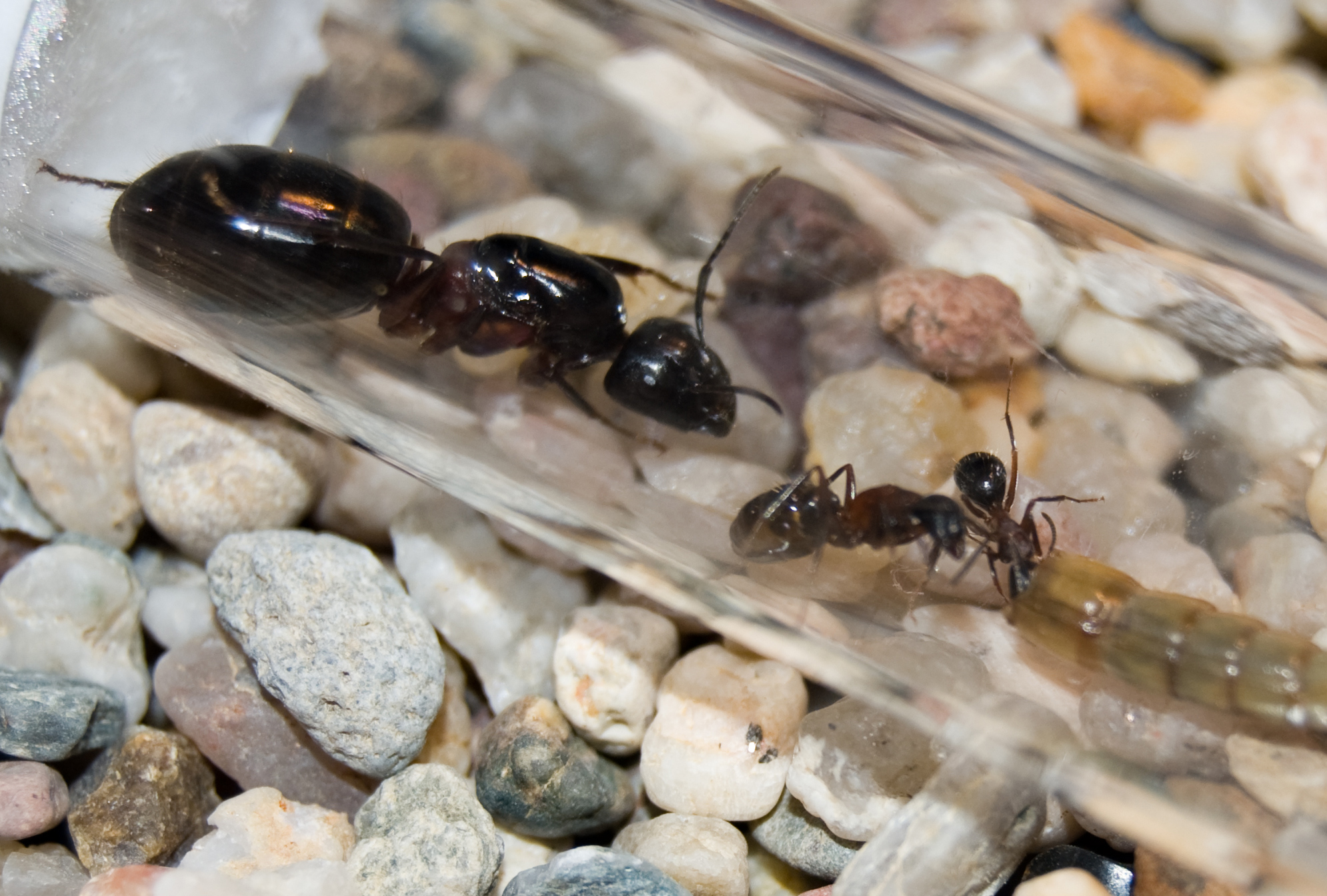 Hehe, so bin ab heute auch ein stolzer Besitzer einer Camponotus ligniperda- Kolonie. Sie besteht aus einer Gyne und 3 Imagines und ca 3 groĂen und 5 kleinen Larven . 4 Eier sind auch vorhanden.