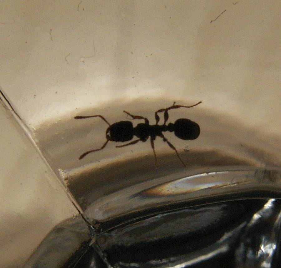 Die 2. Art: GrĂ¶ĂŸe der Arbeiterinnen ca. 0,2 cm. Sie sind durchgehend schwarz. Sie bewegen sich sehr langsam. Kein Vergleich zur 1. Art. Viellecht hĂ€ngt es mit der GrĂ¶ĂŸe zusammen. Der Kopf ist etwas grĂ¶ĂŸer als die Gaster und die hinteren Beine sind sehr kurz. Auf einem Foto sieht man an der Gaster einen braunen Streifen