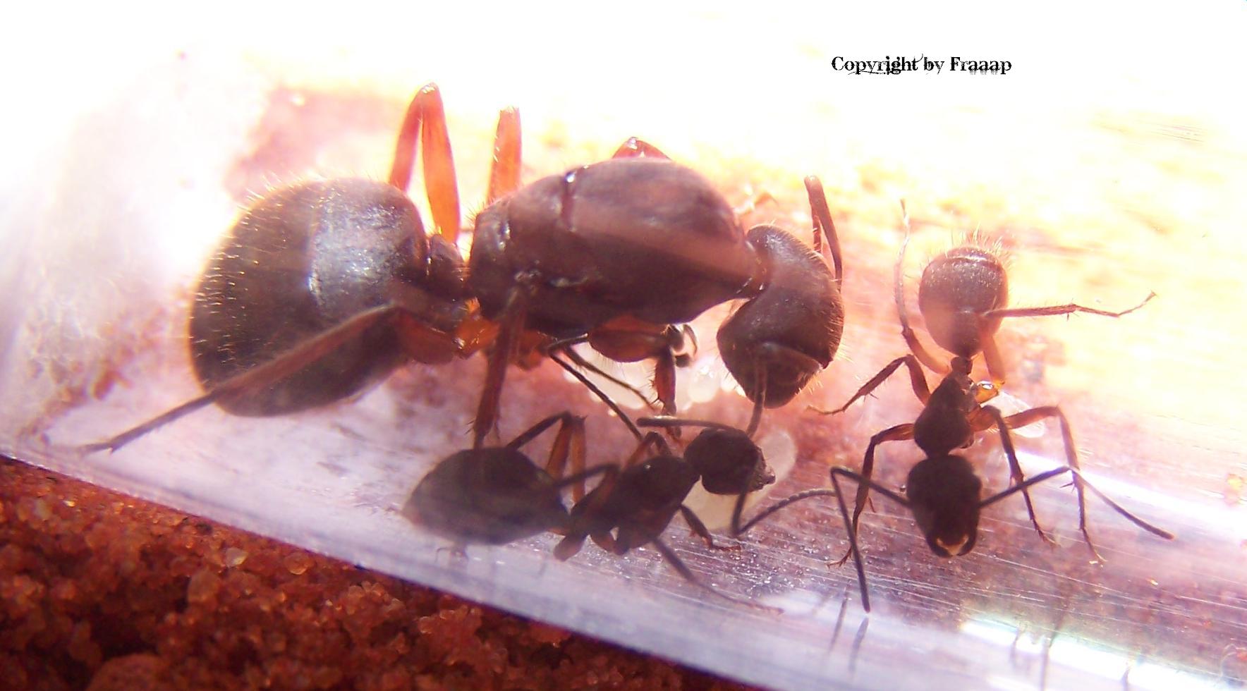 BeobachtungenBei Camponotus rufipes ist mir ein anderes Jagdverhalten als bei meinen restlichen Arten aufgefallen. Das Beuteschema lĂ€uft bei meinen anderen Arten folgendermaĂen ab: Wird Nahrung entdeckt, testet ein Scout aus ob diese Ergiebig ist. AnschlieĂend werden andere Arbeiterinnen rekrutiert. Nach und nach stoĂen mehr Arbeiterinnen zu der Nahrungsquelle, zerlegen diese und schleppen sie ins Nest. Der Weg zur Nahrung erfolgt stets direkt, keine Umwege werden gelaufen.