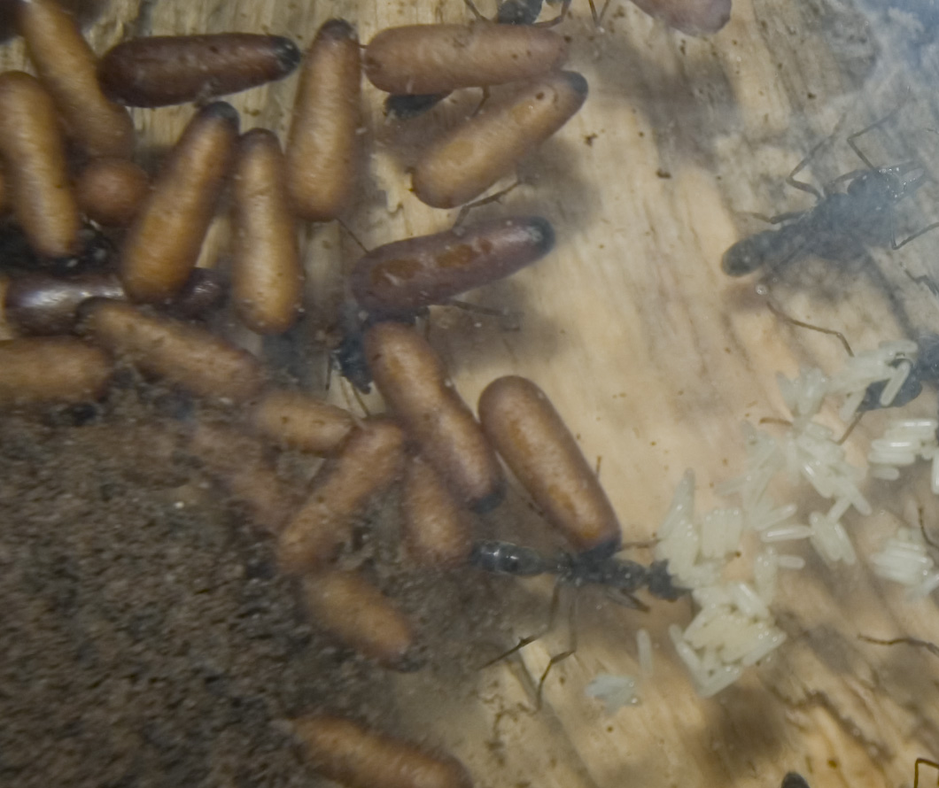 Zu erkennen sind natürlich Puppen, kleine und große Larven, die bei Pachycondyla apicalis behaart aussehen und die kleinen stäbchenförmigen Eier.