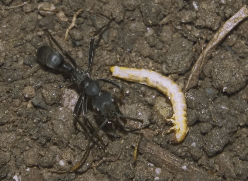 Die Mehlwürmer nehmen sie am liebsten lebendig an. Sie greifen sie an, und ziehen sie aus der Erde heraus. Der Mehlwurm wirft die Ameise um sich, während sie versucht den Stachel anzusetzen. Das ganze dauert meistens ca. 5 Sekunden, ab dann bewegt sich der Mehlwurm nicht mehr -wirksames Gift!