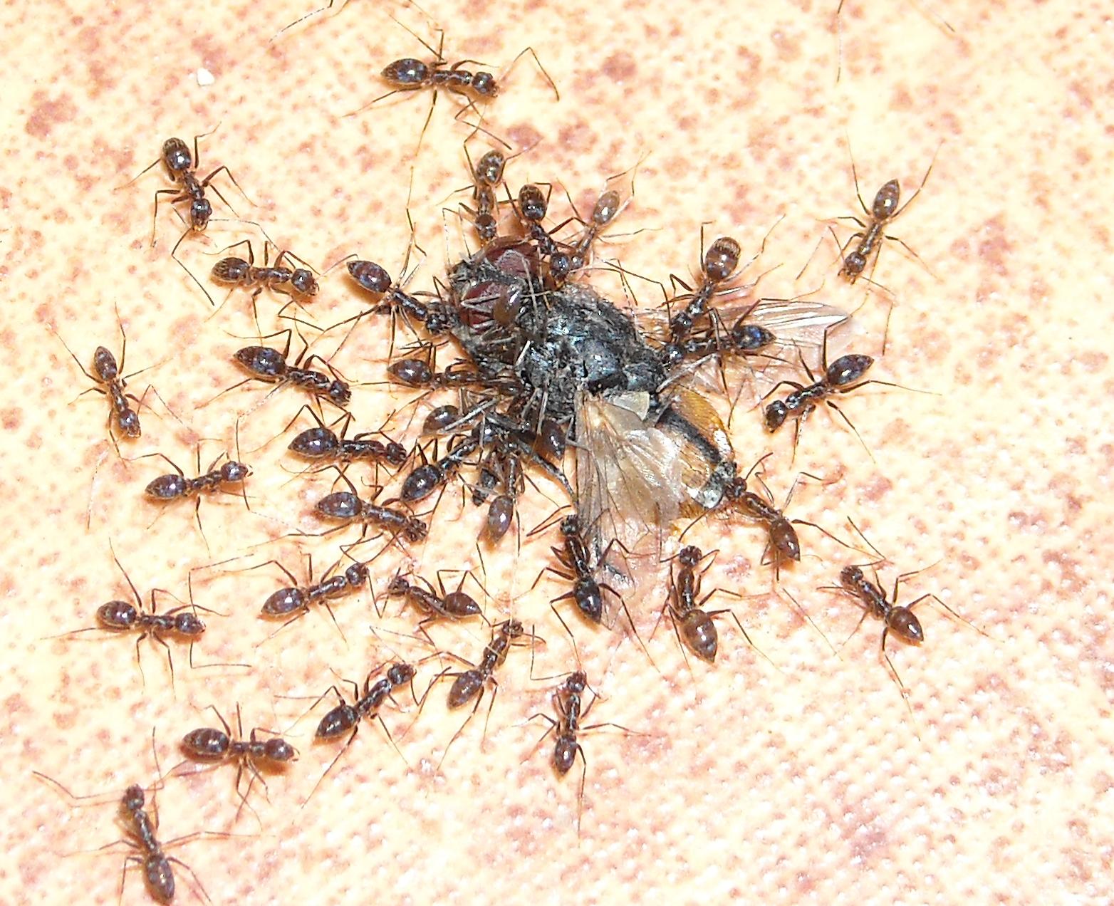 Die andere Art war winzig klein (1,5 -2 mm) und hatten glaub ich einen hellen Hinterleib. Sie haben eifrig ein StĂŒck Dotter unter meinem Tisch zerlegt und abtransportiert.