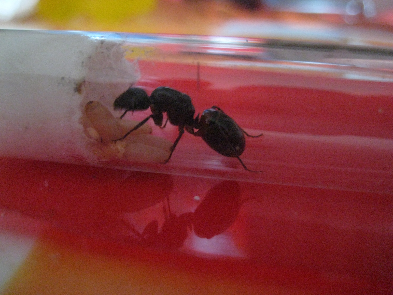 29.07.2008 Achtundzwanzigster Tag Ich habe es gewagt! Heute habe ich die rote Folie vom Reagenzglas entfernt und sie durch eine andere ersetzt! Enttäuschendes Ergebnis, denn die neue Folie lässt mir noch weniger Einsicht in das Reagenzglas. Die Vorherige Folie war eine Schutzfolie für z.B. Schulbücher und war leicht milchig. Jetzt habe ich die Folie benutzt, die ich auch für den Bau des Y-Tong Nestes verwendet habe. Im Nachhinein musste ich jetzt leider feststellen, dass man durch die andere Folie zwar alles nur sehr verschwommen gesehen hat, jedoch ließ sie mehr licht einfallen! Leider sehe ich jetzt noch wesentlich weniger. Ich werde mir jetzt schnell noch einmal die andere Folie besorgen und diese wieder verwenden müssen. Leider ist dies zwingend notwendig, da ich die Ameisen ja nun im Reagenzglas überwintern lassen will, ohne Einsicht in das Reagenzglas wäre das ein Himmelfahrtskommando! Dieses Risiko möchte ich bei weitem nicht eingehen. Schließlich habe ich der