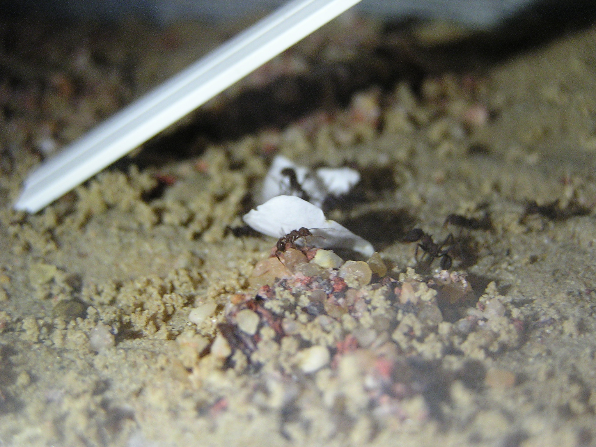 Wie schon erwĂ€hnt, ist der Pilz durch wahrscheinlich zu viel Wasser etwas eingegangen oder verfault. Es ist nicht gerade viel ĂŒbrig geblieben, ich musste alles entfernen. Zum GlĂŒck hatten die Ameisen schon reichlich neuen gezĂŒchtet vorher. Ich habe den Rest der noch ĂŒbrig war in so eine kleine durchsichtige Dose getan mit etwas feuchten TĂŒchern. Ich habe die Dose heute in das neue Pilzbecken gelegt, und mit roter Folie ĂŒberdacht. Die Ameisen tragen schon die ganze Zeit die Watte in kleinen StĂŒcken aus der Dose raus, kann gut sein das sie Platz fĂŒr den Pilz machen wollen weil viel ist nicht mehr. Die Ameisen bauen den Eingang des Röhrchen/Dose mit Sand-Lehm zu, was ganz normal ist. Jedoch habe ich so meine bedenken was das Futterbecken und seine Entfernung an geht. Finden sie das? Ist das nicht zu weit? Es befindet sich keine auf den Stufen, oder in Richtung Verbinder. aber ich denke mal erst wenn sie komplett die Bauarbeiten abgeschlossen haben, und wenn sie wieder Material brauchen dann kommen sie und suchen bis sie finden nach Futter denke ich. Ich brauche mir da bestimmt keine Sorgen machen. Das Ding ist bloss, das viele Arbeiter ja verstorben wahren, und es sind nun nicht mehr so viele Arbeiter wie es sein mĂŒssten. Deswegen habe ich Bedenken, aber es ist viel