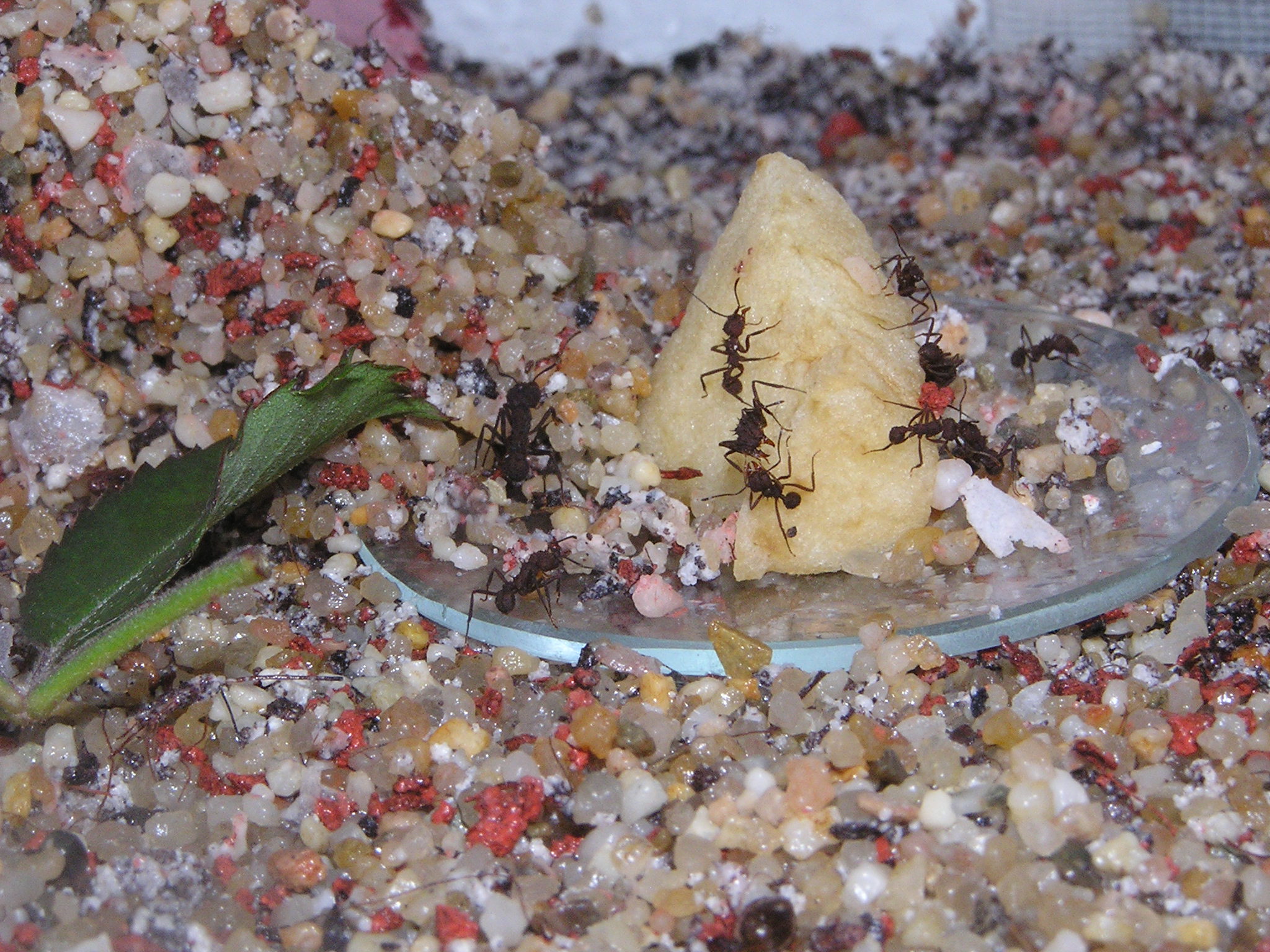 Bestehen wie oben schon erwĂ€hnt, aus ein Schmalglasbecken 30x10x20 cm, welche den Ameisen als Nestbecken/Pilzbecken dient. Desweiterin habe ich ein normales 30x20x20cm Becken angeschlossen ĂŒber Beckenverbinder von Antstore, welches als Futter und Auslaufarena dienen soll. Das Arenabecken ist mir Kies gefĂŒllt welcher noch mit etwas Sand-Lehm vermischt wurde. Das Pilzbecken ist mit normalen Sand-Lehm gefĂŒllt worden von mir, und hat eine höhe von ca. 1 1/2 - 2 cm was ausreichend ist. Ich habe in beiden Becken aus der Terrarienhandlung einen Stein der PilzĂ€hnlich aufgebaut ist, in diesen habe ich zur Decko ein paar kunstbĂ€umchen gesetzt. Sie haben eine WassertrĂ€nke im Futterbecken, und eine Schale worauf die BlĂ€tter liegen. Honig oder sonstiges bekommen sie vorerst nicht, sie schneiden nĂ€mlich dann keine blĂ€tter. Sie schneiden so schon sehr sehr wenig, was schon doof ist. Sie nehmen auch sehr sehr gern Apfel, habe aber erstmal keinen angeboten. Erstmal sollen sie durch BlĂ€tter den Pilz stabeliesieren, und dann gibt es wieder Abwechslung.