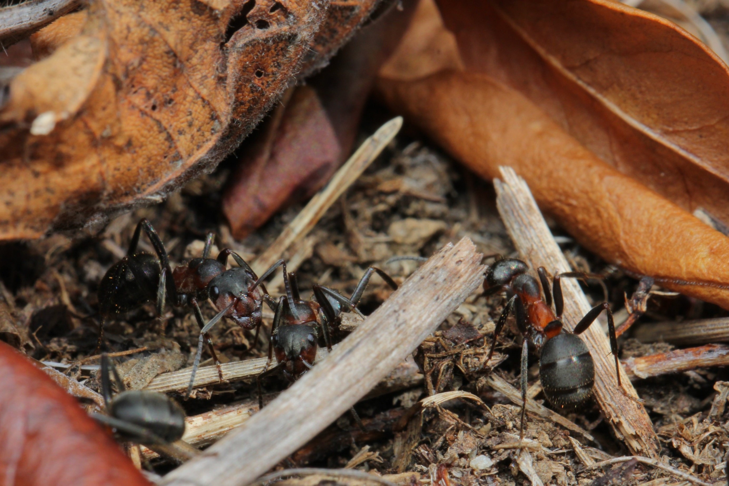7. Dieses Bild stammt noch aus dem Oktober: Formica s. str. und Formica fusca im Clinch. Es ging um ein totes Insekt. Allein der GrĂ¶ĂŸenunterschied der Köpfe ist schon beachtlich!