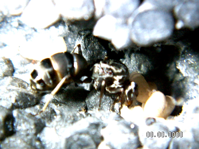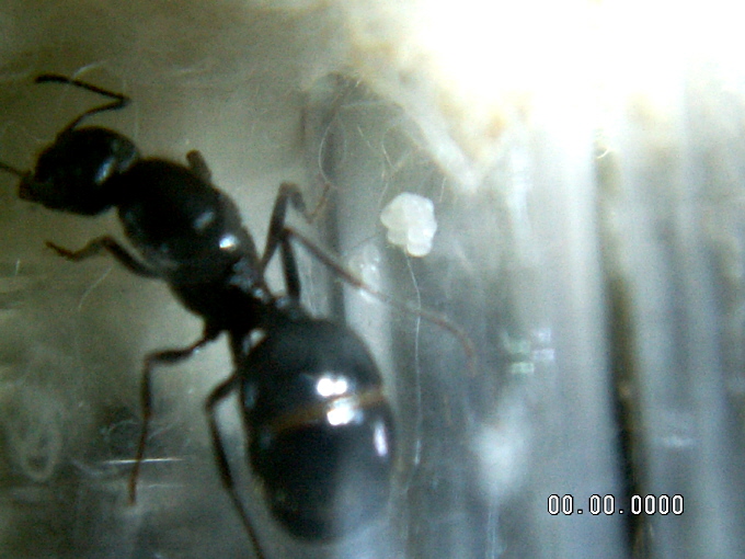 Auf den letzten drei Bildern eine fernöstliche Serviformica-Art, Formica japonica. Eine gut genährte Jungkönigin mit ihrer ersten Arbeiterin und verschiedenen Brutstadien.