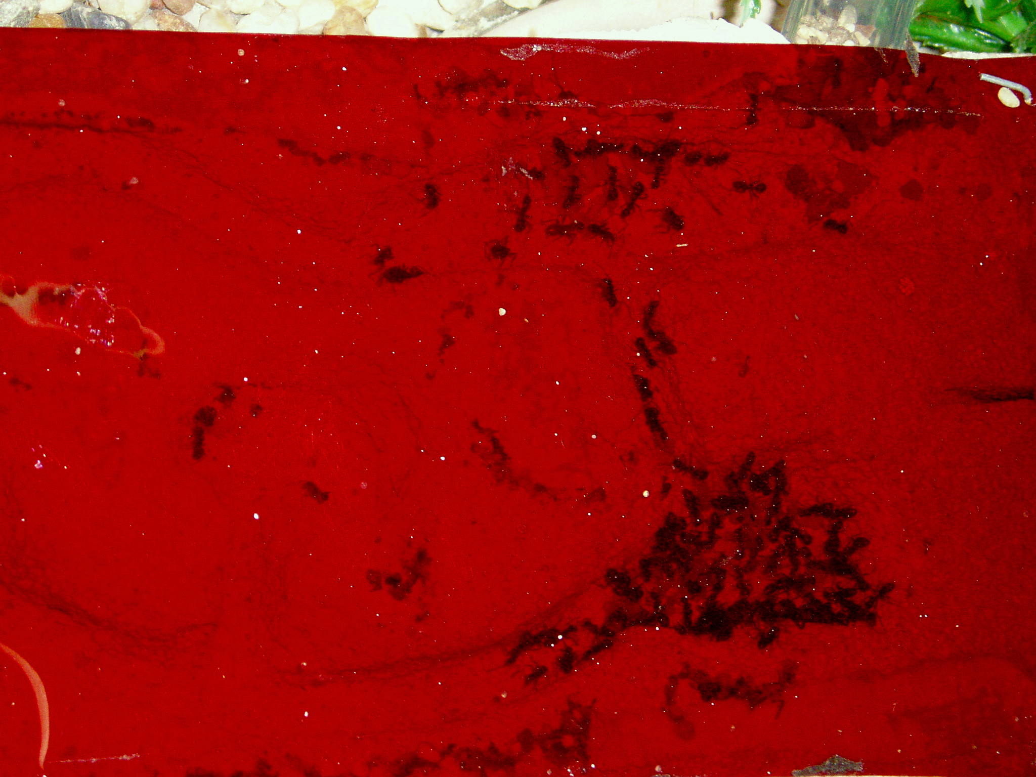 Gaster wohlgemerkt). Die Kleine hat sich dann ein paar Millimeter vorwärts geschleppt, und dann wie eine Maschine, die plötzlich kein Strom mehr hat ganz plötzlich stehengeblieben. Da fiel mir dann auch schon auf, dass es kein Einzelfall ist. Im ganzen Formi fand ich einzelne Ameisen, einige schienen irgendwie zusammengekrampft, aber die Meisten waren, wie die beschriebene, einfach an Ort und Stelle stehengeblieben. Eine hatte sogar ein Steinchen in den Zangen und ist genauso stehengeblieben, mit Steinchen, ausgesteckten Fühlern usw. Das Ganze sah teilweise einfach aus als sei die Zeit stehen geblieben, oder wie ein Foto von Ameisen in "vollem Betrieb". Im Nest war noch fleißig gewusel, die Kolonie war insgesamt schon beachtlich groß, mit geschätzen 200 einzeltieren im 2. Jahr. Das hat sich innerhalb eines Tages dann auch gelegt, nach ca. 1,5 Tagen war die gesamte Kolonie auf diese seltsame Art abgestorben, einzig die