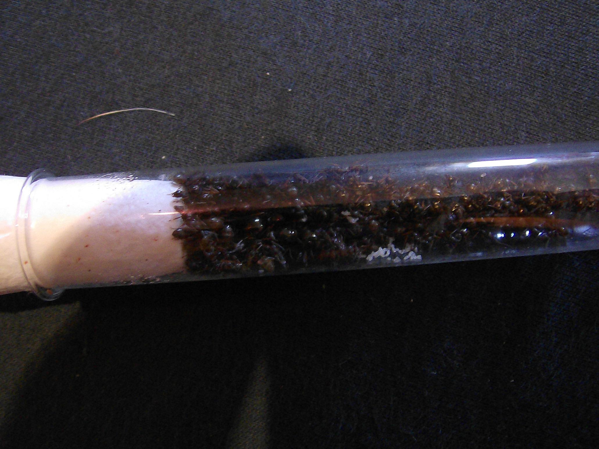 So, die letzte meiner Pygmäen ist nun auch verstorben, vermutlich weil nichtmehr furagiert wurde. Da sich nun niemand mehr um die Larven kümmert und sie zu Puppen heranzieht, habe ich das Reagenzglas geöffnet.