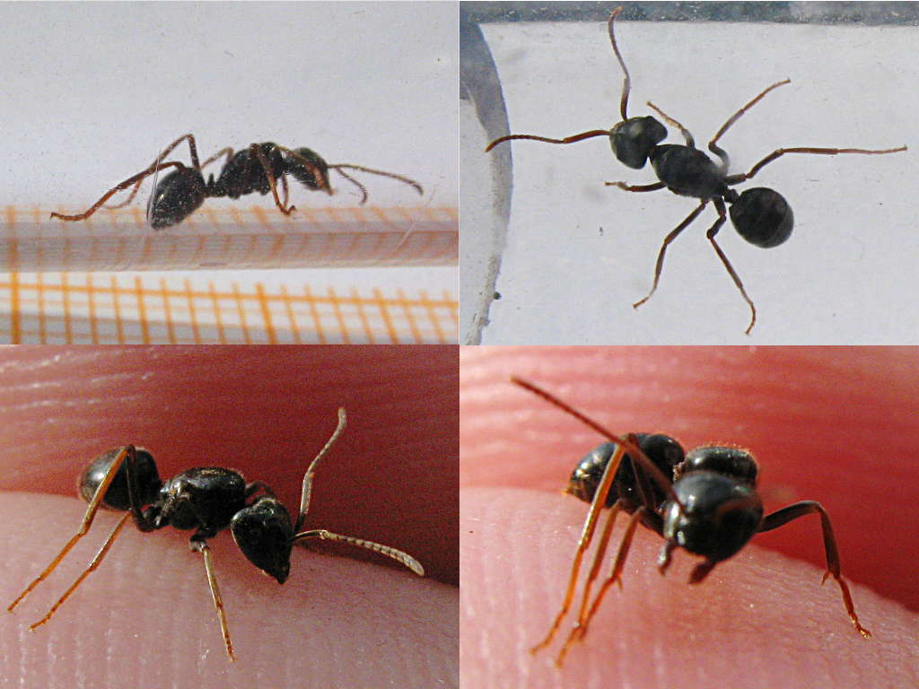 Mit den oberen Bildern im neuen Viererblock kann ich (als Laie) nun auch Messor ausschlieĂen. Man kann eindeutig die Schuppe sehen und der Knoten bei Messor ist lĂ€nger und schmaler. Manche Ameisen haben ja eine LĂŒcke oder Ausbuchtung im ersten Beinpaar zum Antennen putzen. Diese scheint einen Sporn oder Borsten zu haben, gut zu sehn im Bild unten rechts.