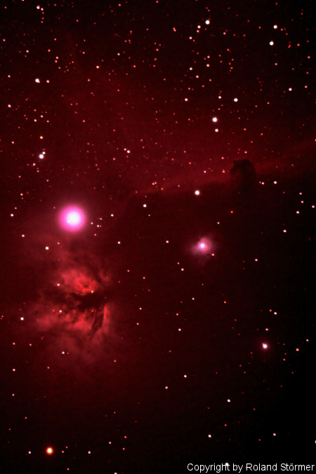 Das Bild zeigt den Flammennebel NGC2024 im Sternbild Orion und daneben den Pferdekopfnebel B33. Der Pferdekopfnebel ist ein Dunkelnebel, eine Staubwolke, die vor dem Emmissionsnebel IC434 steht und ihn abdunkelt. IC434 leuchtet im roten Licht des einfach ionisierten Wasserstoffes. Der helle Stern neben NGC2024 ist Alnitak. Alnitak ist der linke der drei Sterne im GĂŒrtel des Orion und ĂŒber 81000 Lichtjahre von uns entfernt. Die Aufnahme entstand am 25.01.2009 gegen 21.00Uhr mit einer modifizierten Canon EOS 1000D am ZenithStar II Doublet APO von William Optics. Belichtet und mit DSS gestackt wurden 70 Bilder (10-30sec.) bei ISO 800 und ISO 1600. Somit entstand eine Gesamtbelichtungszeit von etwa 28 Minuten. NachgefĂŒhrt wurde mit einer Celestron Advanced GoTo CAM ohne Autoguiding.