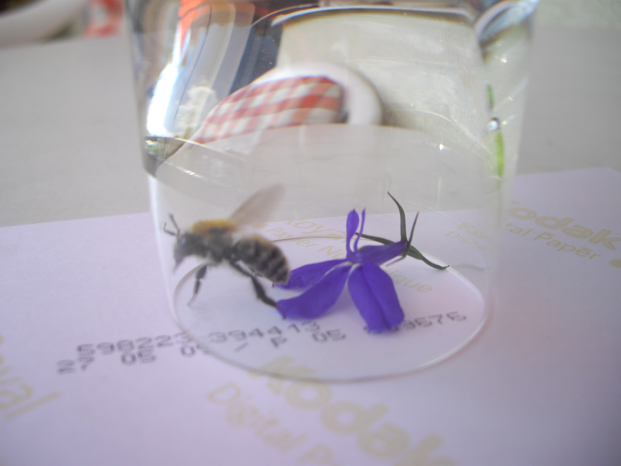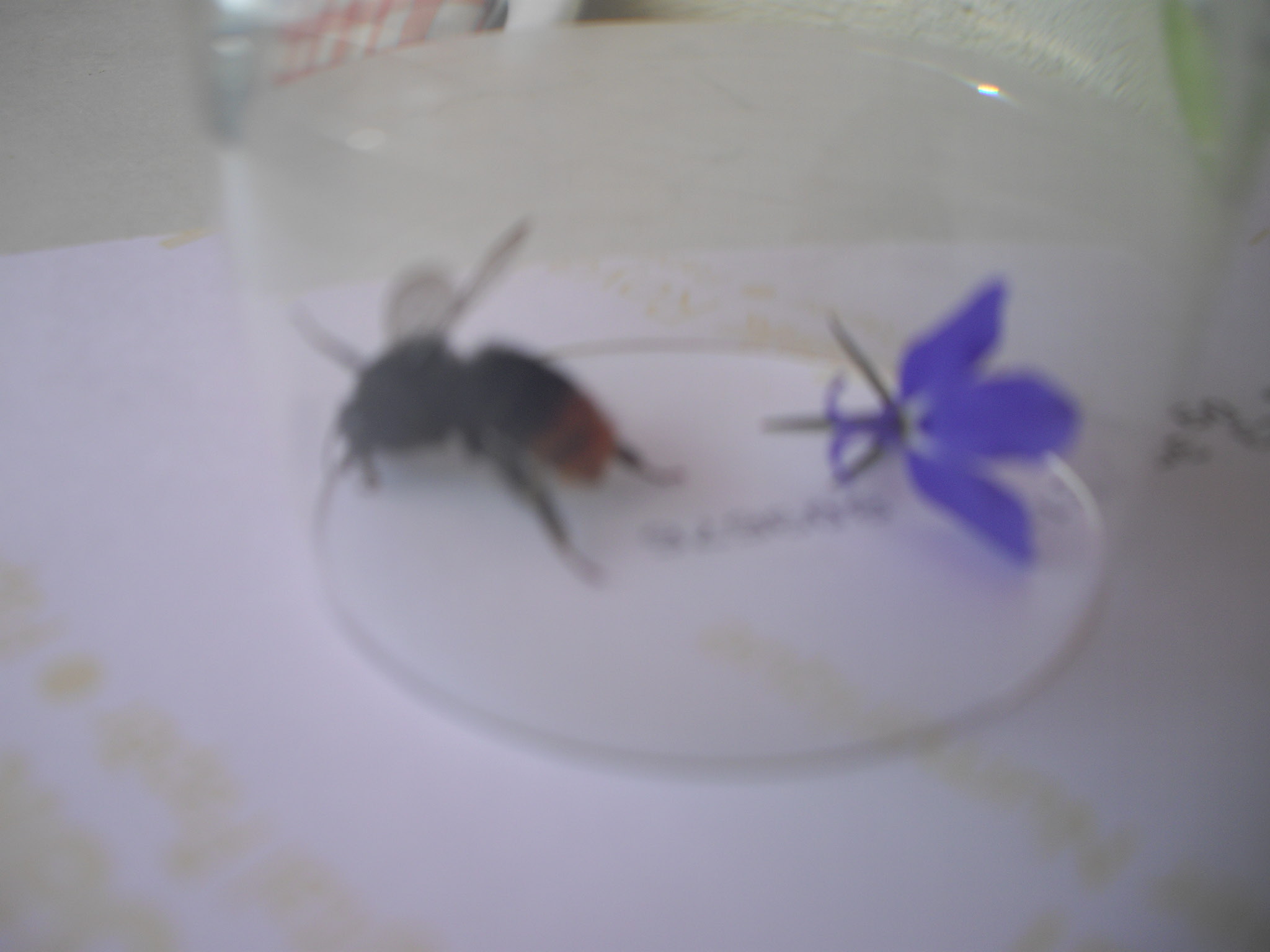 Die eine Art (Bild 4-6) war vermutlich eine Steinhummel, sie war mit fast 2 cm recht gross, und hatte keine Pollenbeutel an den Beinen, hat nur immer in der BlĂŒte rumgesaugt. Der Hinterleib war rötlich-braun, der Rest schwarz, daher laut Schnellbestimmungstabelle eine Steinhummel. Die Vermutung hatte ich aber auch ohne die Tabelle. Hat sich im Glas zwar relativ schnell beruhigt, aber hat trotzdem rumgezappelt.