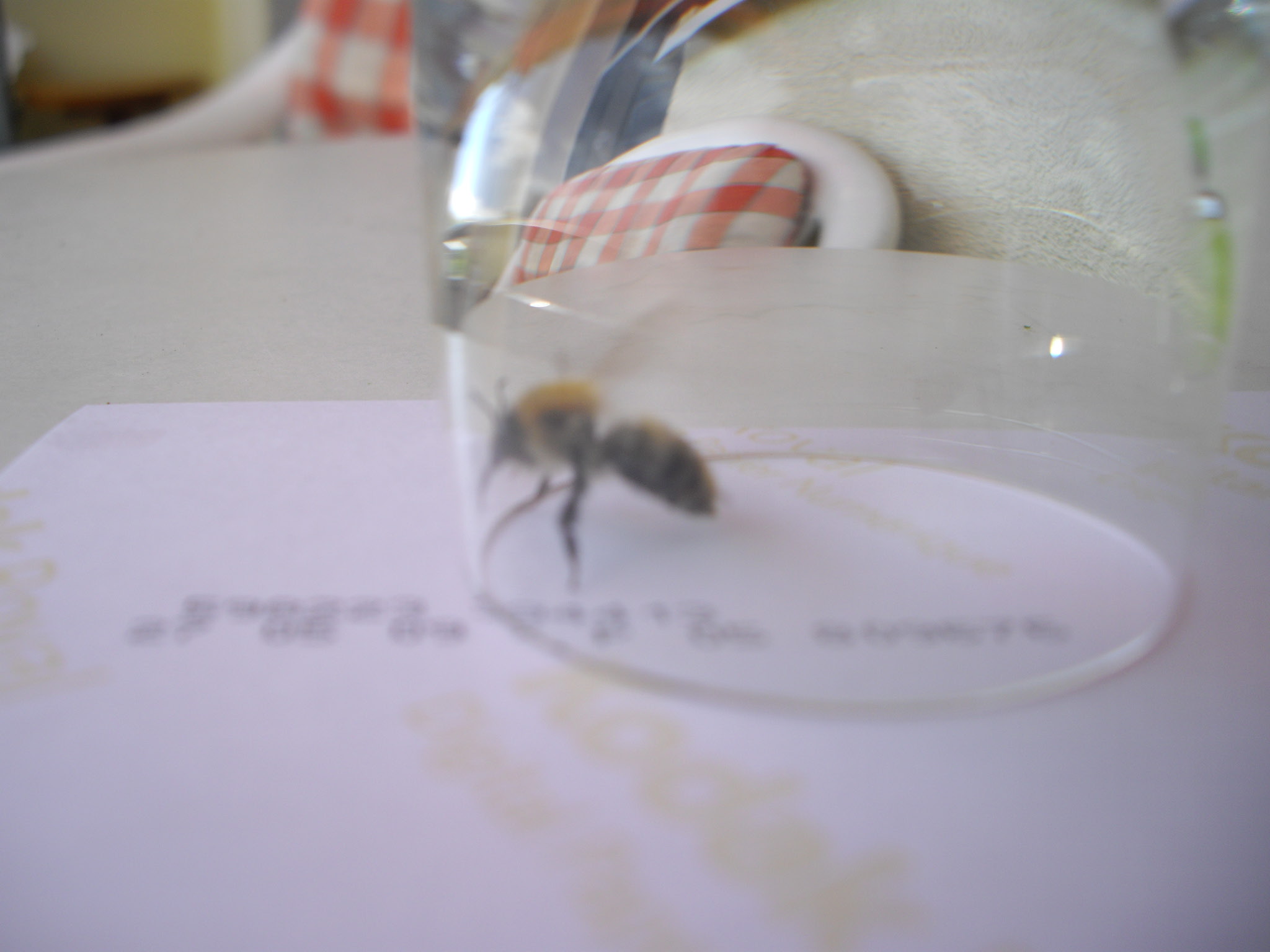 Die zweite Art (Bild 7-10) war kleiner (ca. 15mm) und könnte eine Ackerhummel gewesen sein. Der Hinterleib war gelb-schwarz gestreift, der Thorax war gelb und vom Körperbau hĂ€tte man meinen können, es wĂ€re eine ĂŒbergewichtige Biene. Hat sich auch im Glas kaum beuhigt und sofort eine extreme Bereitschaft zum Stechen gezeigt, obwohl nur das Glas da war. Schon nach 4-5 Sekunden lag sie das erste mal auf dem RĂŒcken. Selbst die BlĂŒte im Glas konnte die Tierchen nicht wirklich kurz beruhigen fĂŒr ein Bild. Schade. Die dritte Art war vermutlich eine Baumhummel, da der Thorax durchgĂ€ngig rötlich-gelb gefĂ€rbt war und der Hinterleib eine weisse Spitze hatte.