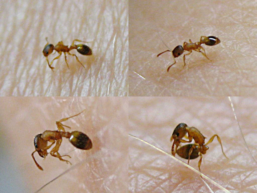 Ameisen: Sie sind etwa 3mm lang. Die Kopfoberseite ist dunkelbraun, die Unterseite heller, das/die Mesosoma ist rötlich-hellbraun, die