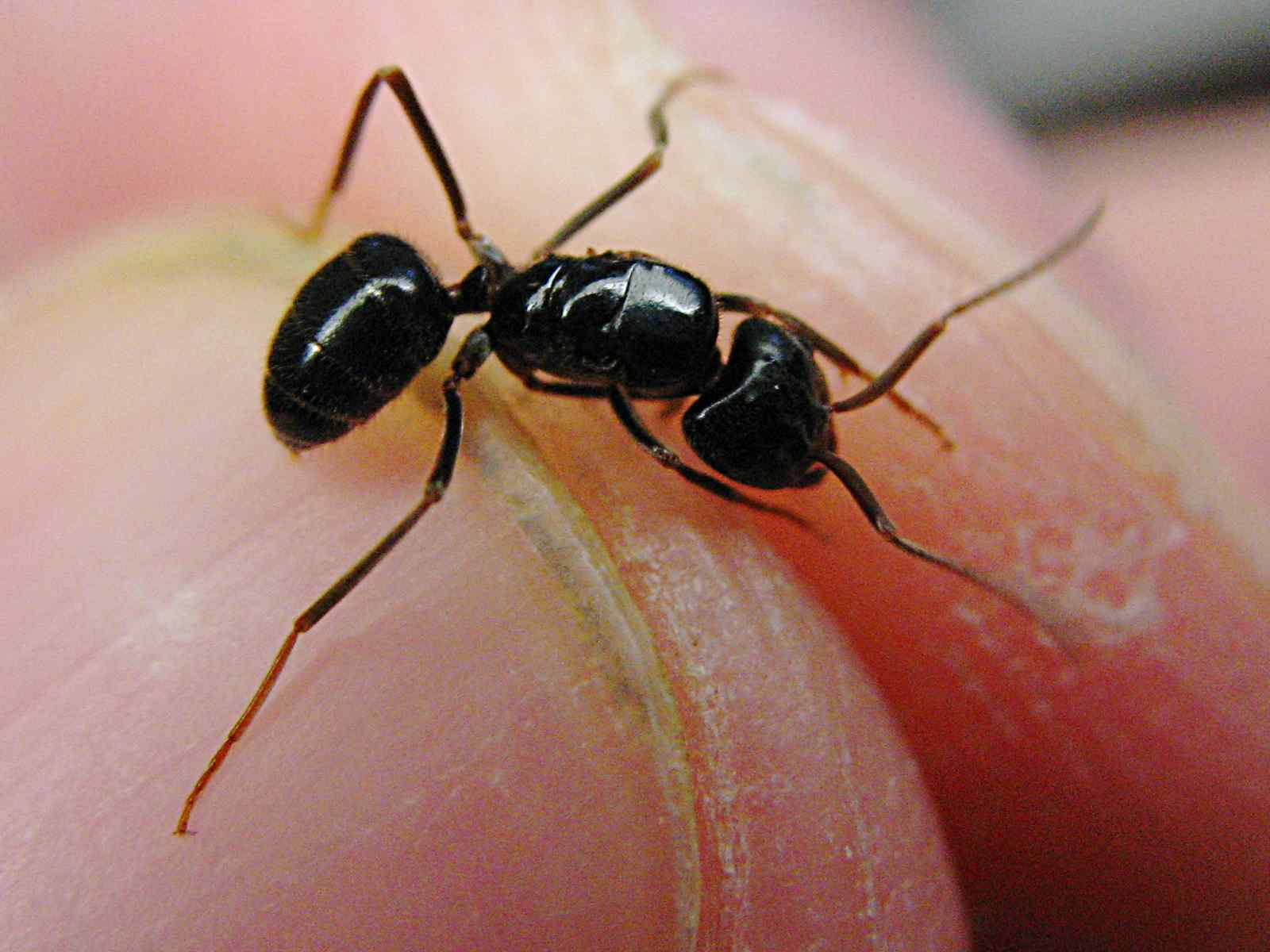 Bild 5: Gerade lad ich die Bilder von der Kamera, da läuft die nächste Ameise quer über den Schreibtisch. Schwarz, schlank, etwa 8mm. Vielleicht Lasius fuliginosus? Ich hab sie gleich wieder vor die Tür (oder besser an den Baum) gesetzt. Die letzte Ameise dieser Art, die ich gefunden hab, war allerdings deutlich kräftiger.