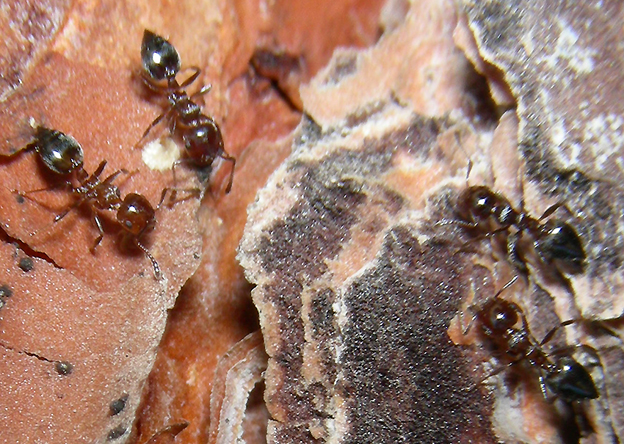 Foto10: Einige Soldaten und Arbeiterinnen von P. pallidula bearbeiten eine Frucht.