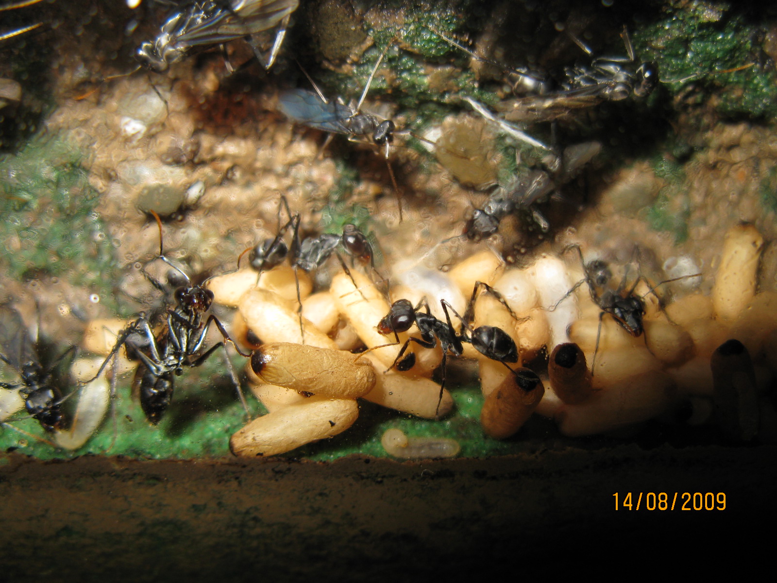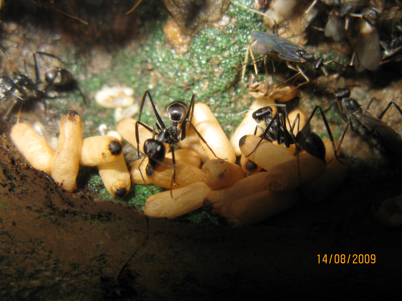 Bisher habe ich nur wenige Bilder aus dem Nest der Gigantiops gezeigt. Deswegen nun ein paar Bilder aus den Nestkammern. Ihr seht alle Brutstadien, Männchen, Jungköniginnen und Arbeiterinnen. Auf einigen Bildern sieht man die