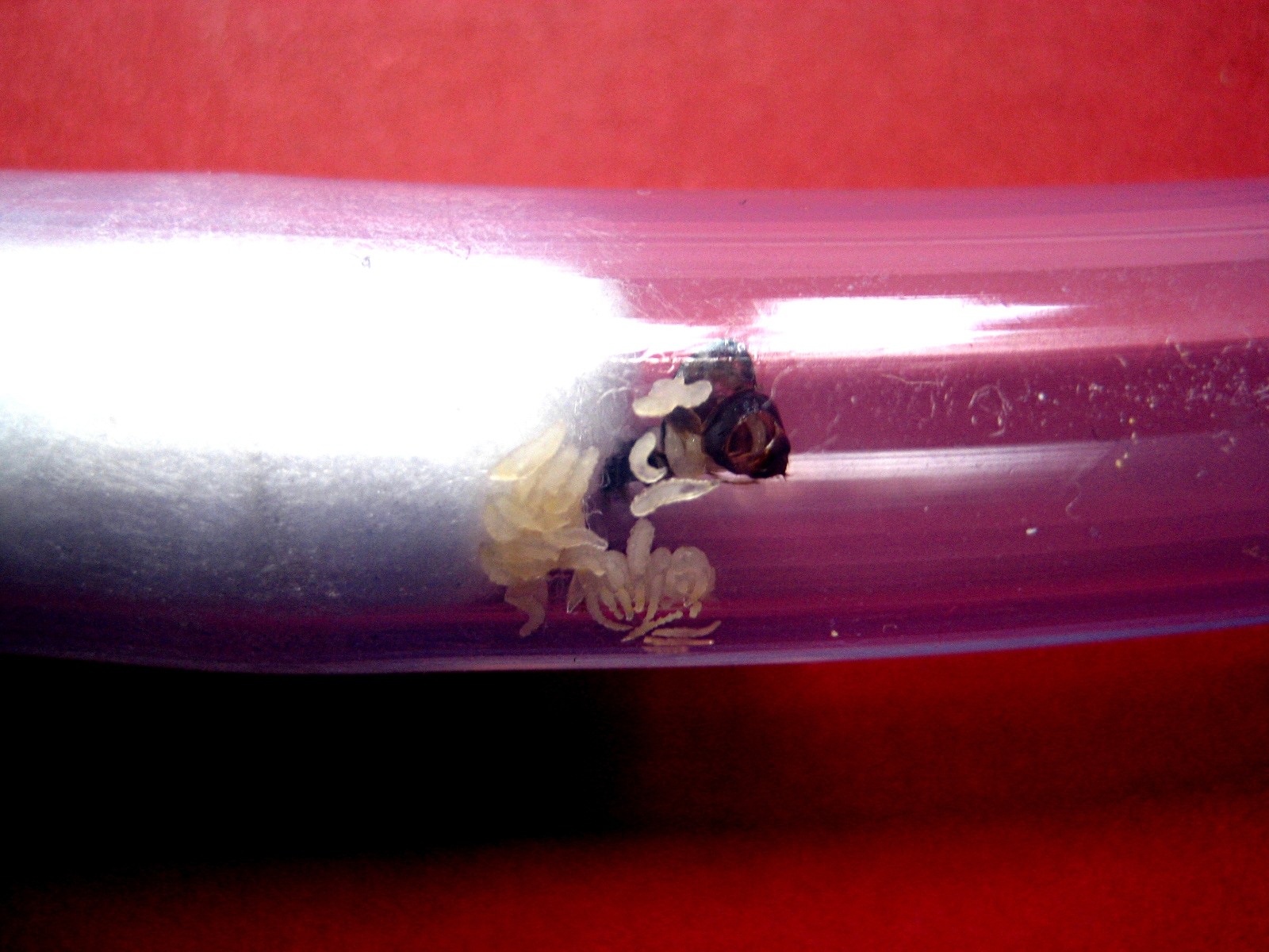 Alles super, nur eine Gyne viel mir auf, die Gaster war weiter gedehnt als bei allen Anderen, außerdem hatte diese Gyne noch keine Eier gelegt, alle anderen schon. Ich machte mir nichts daraus, ich dachte die Gaster ist stĂ€rker geschwollen da noch keine Eier abgesetzt wurden. Es sah auch nicht ungesund aus. Ich merkte mir aber die NachzĂŒglerin und schaute ein paar Tage spĂ€ter noch mal in das Reagenzglas. Ich war entsetzt! Die Gyne war an ihrer Gaster aufgeplatzt, welche auch extrem gedehnt war. Mir bot sich dieses Bild: