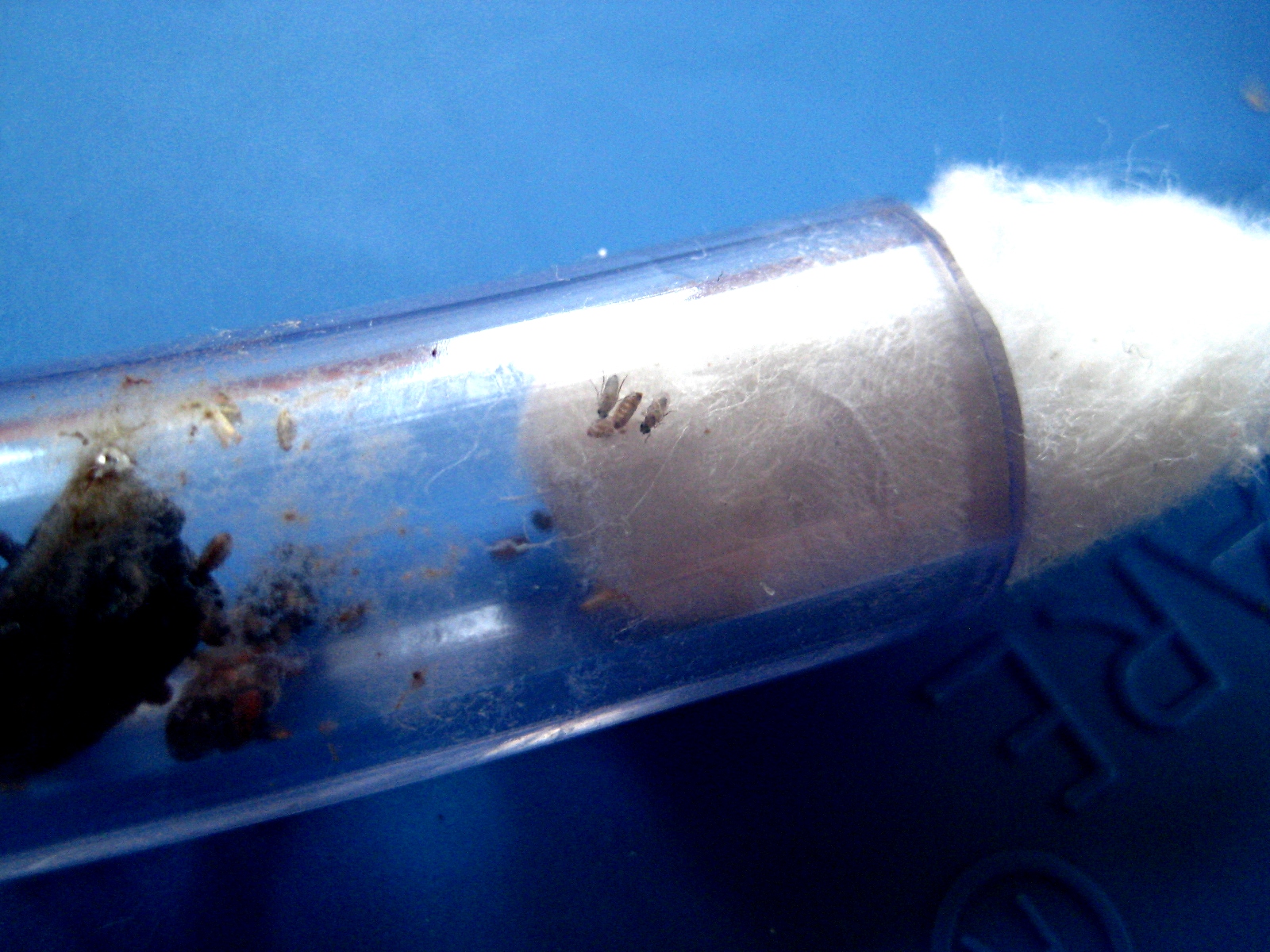 Die Fliegen leben noch und befinden sich noch immer in dem von beiden Seiten mit Watte verstopften Schlauch.