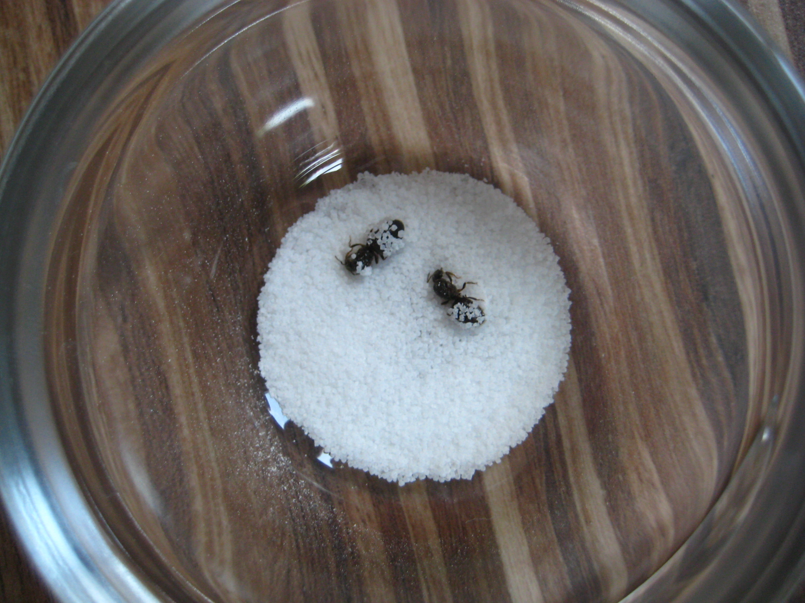 Nach ca. 20min zeigten sie die ersten Lebenszeichen, in Form von einem Beinzucken, ich befreite sie also vorsichtig mit einer Nadel vom restlichen Salz. Ich verteilte es anfangs auf den ganzen Körpern, da die Ameisen wirklich nass waren.