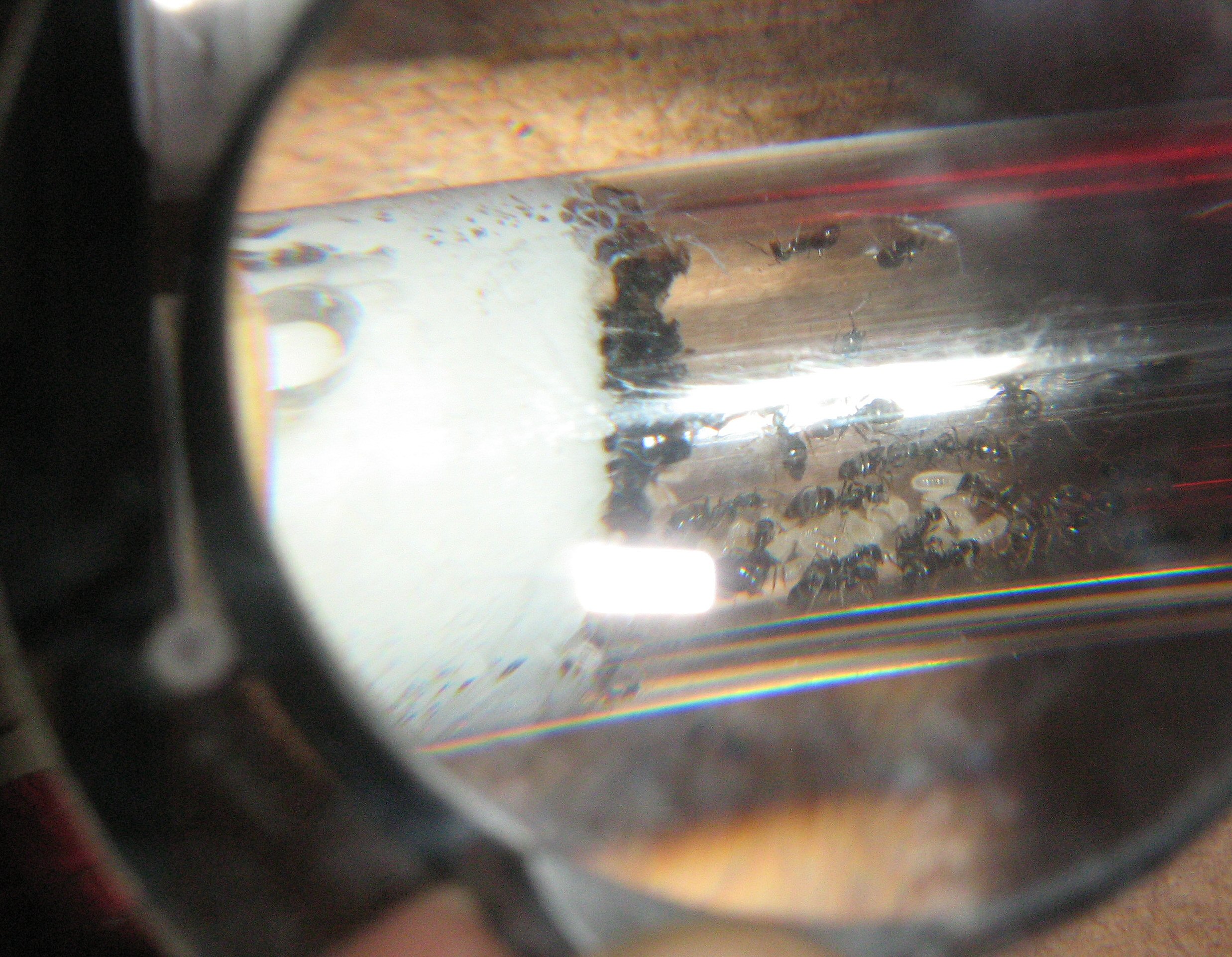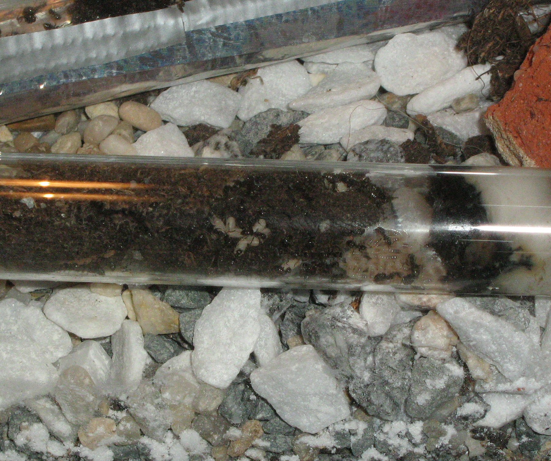 Mittlerweile sind elf Tage vergangen, seitdem ich das neue Acrylnest angeschlossen habe. Viel geändert hat sich eigentlich nichts seit meinem letzten Eintrag. Hier und da wurden mal ein paarLarven in das mittlere, mal ins untere Röhrchen getragen, aber die Aufteilung insgesamt, zwei bewohnte Röhrchen und zwei bewohnte RGs in der Arena hat sich nichts getan.
