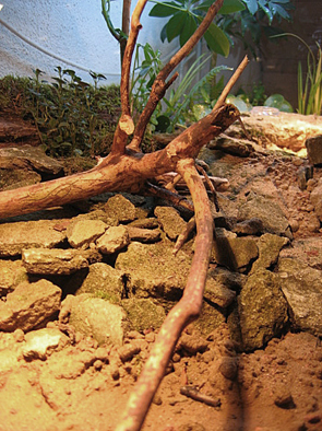 ich zwei 60 Watt und eine 20 Watt Leuchtstoffröhre für die Terraristik mit hohen UV-Anteil verwendet. Die Anlage besteht aus einem eher trockenen Teil (links) und einem feuchterem Teil (rechts).