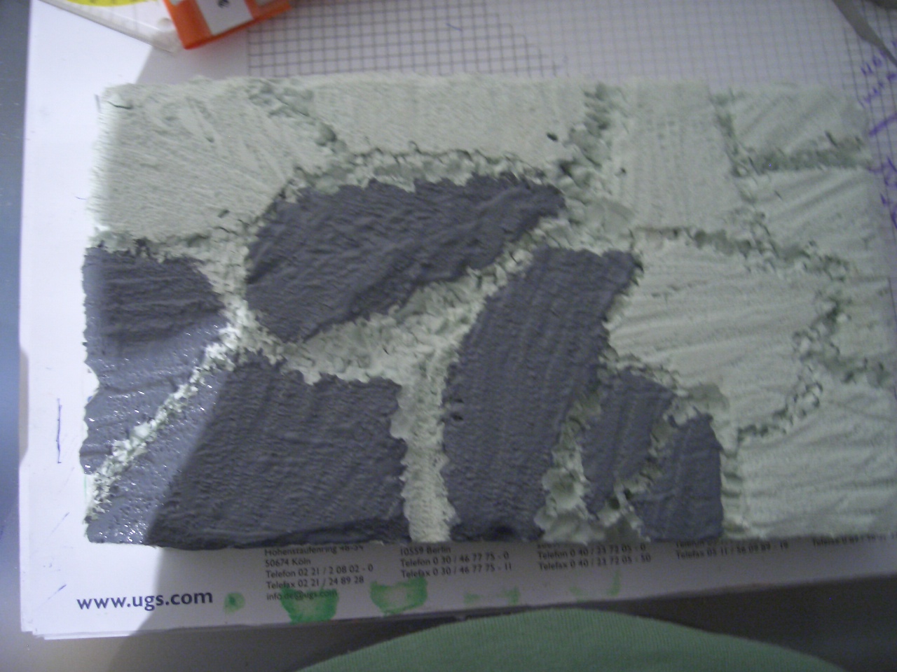 Also habe ich mit der Rückwand angefangen: Mit einem Schraubenzieher die Form reingemeiselt, dann die Lücken mit Hellgrauer Farbe und die Flächen mit Dunkelgrauer Abtönfarbe angemalt. Hier die Bilder: