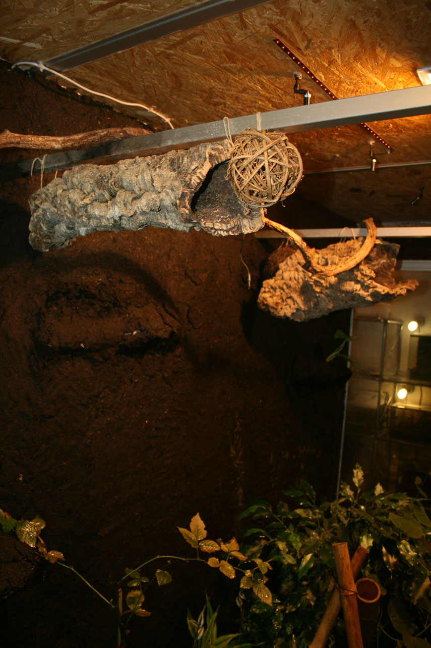 Wie im letzten Post schon angekündigt, musste ich die Vorsprünge entfernen. An den 2 Pfeilern an der Decke habe ich ein paar Korkröhren und Nestbälle aufgehängt. Die Cephalotes cf. pusillus haben sich dort eingenistet und viele der anderen Tiere im Becken verstecken sich darin tagsüber.